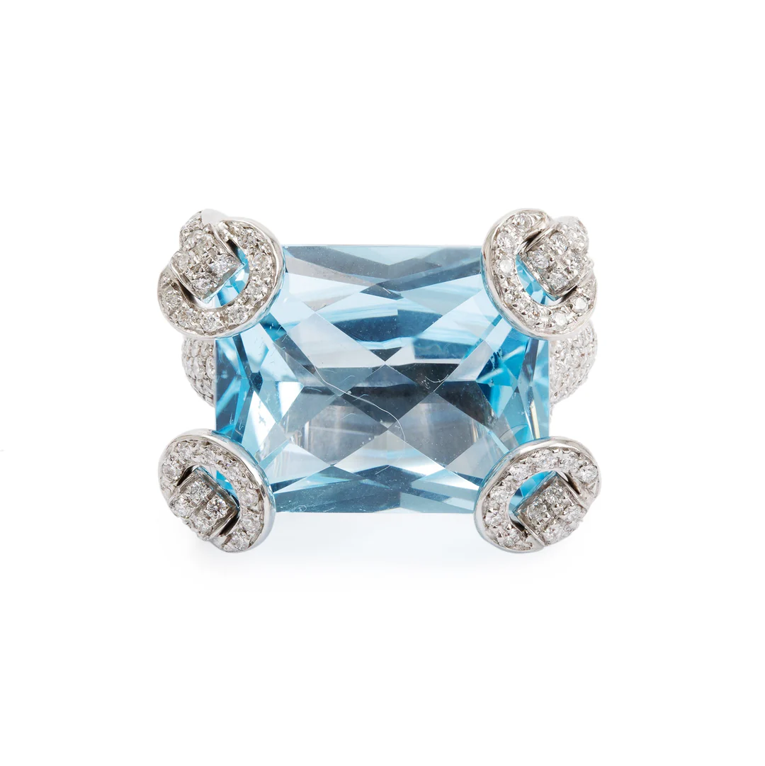 18k White Gold Blue Topaz & Diamond Horsebit Cocktail Ring, Size 4.75