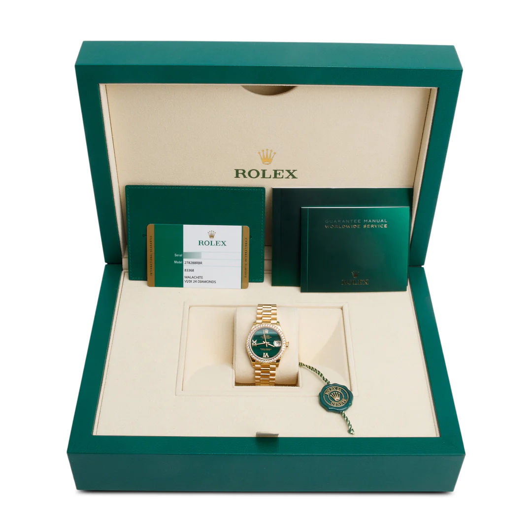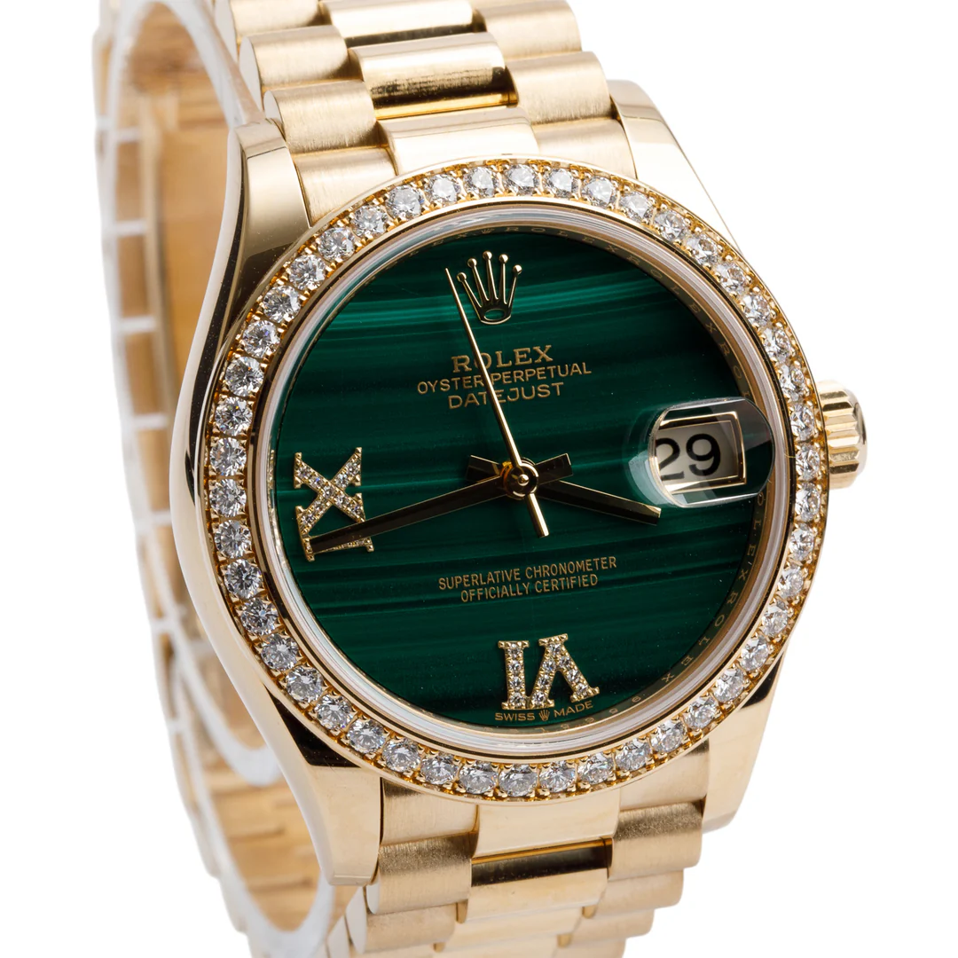 18k Yellow Gold Diamond Bezel Datejust 31 MM Watch Malachite Diamond Dial 278288RBR w/ Box & Papers