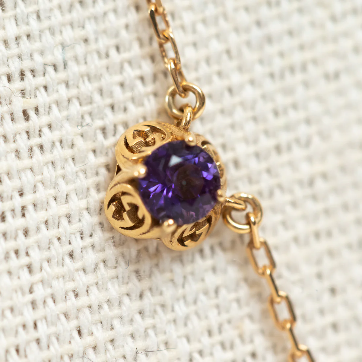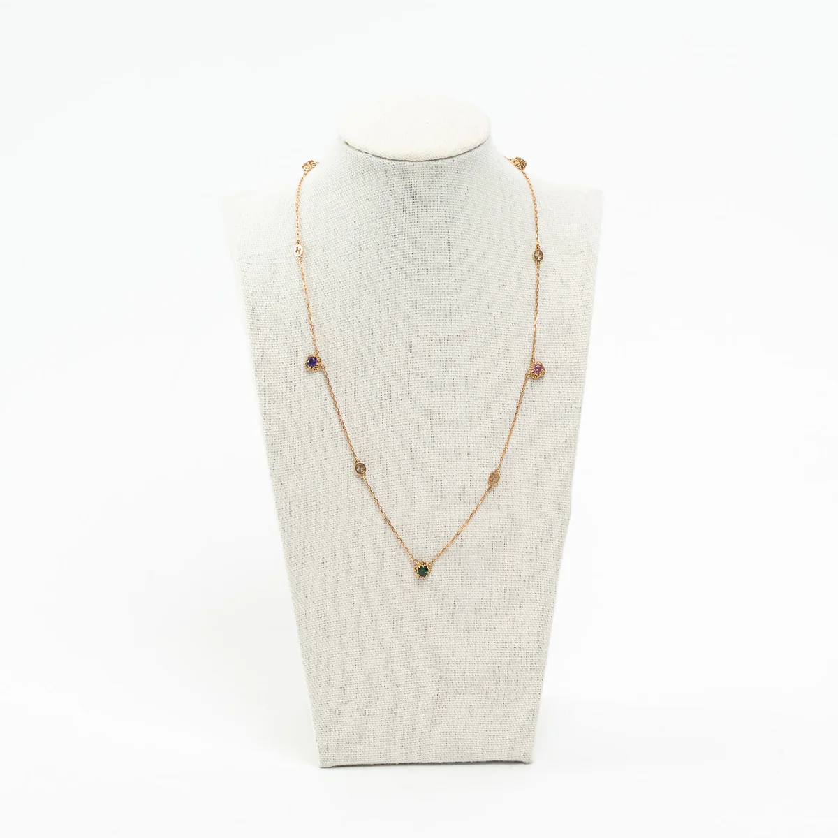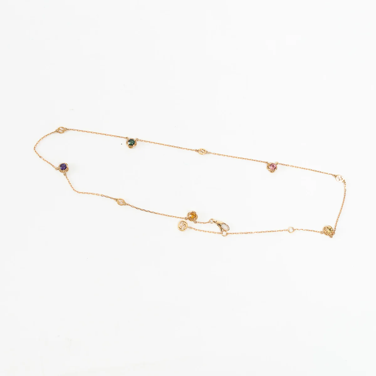 - Features: Thin chain necklace with interlocking G detailing inset with beryl, tourmaline, citrine and amethyst gemstones, Lobster clasp closure
