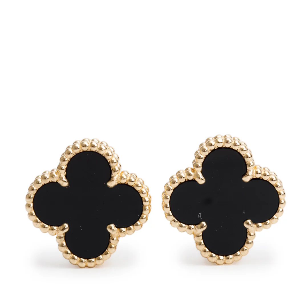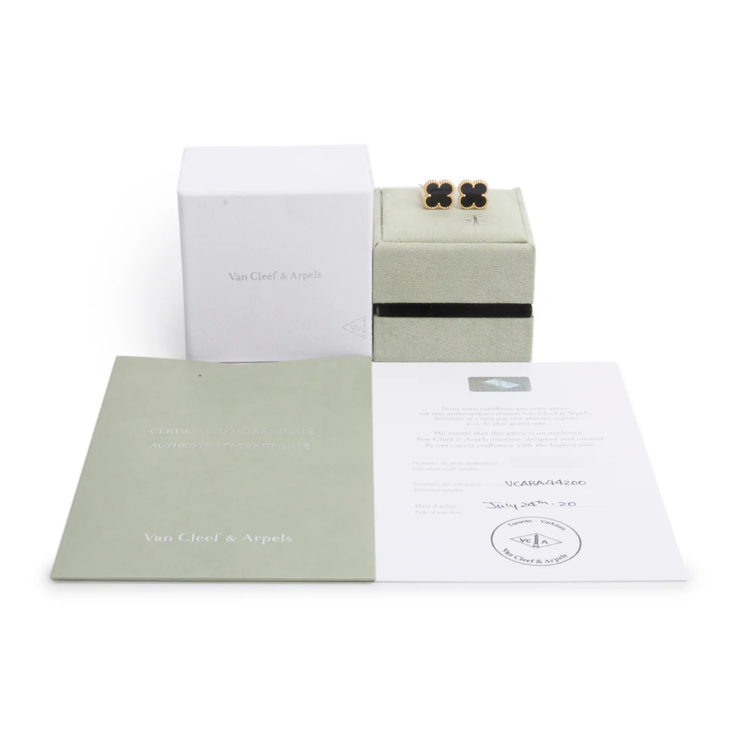2020 18k Yellow Gold Vintage Alhambra Onyx Stud Earrings w/ Box & Certificate