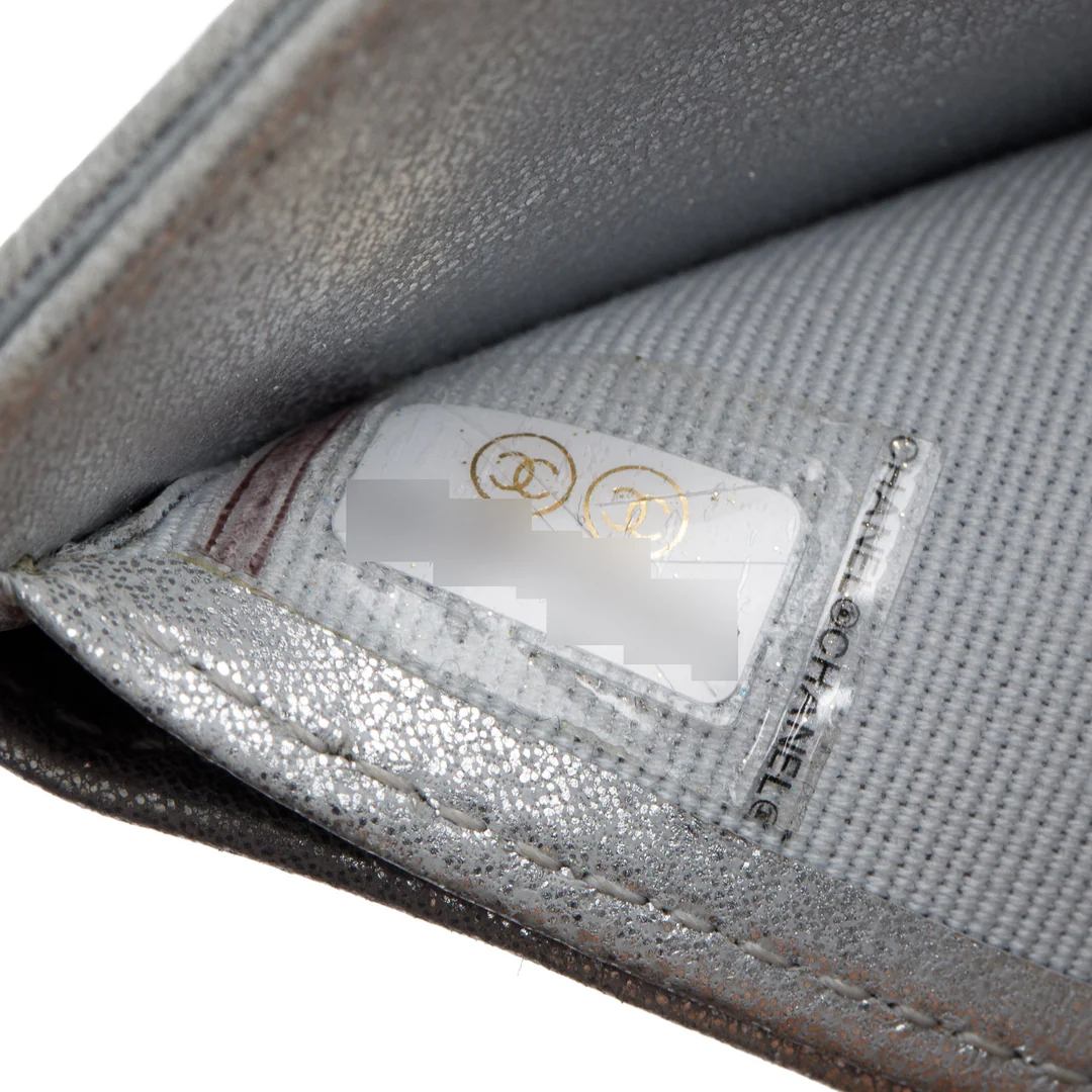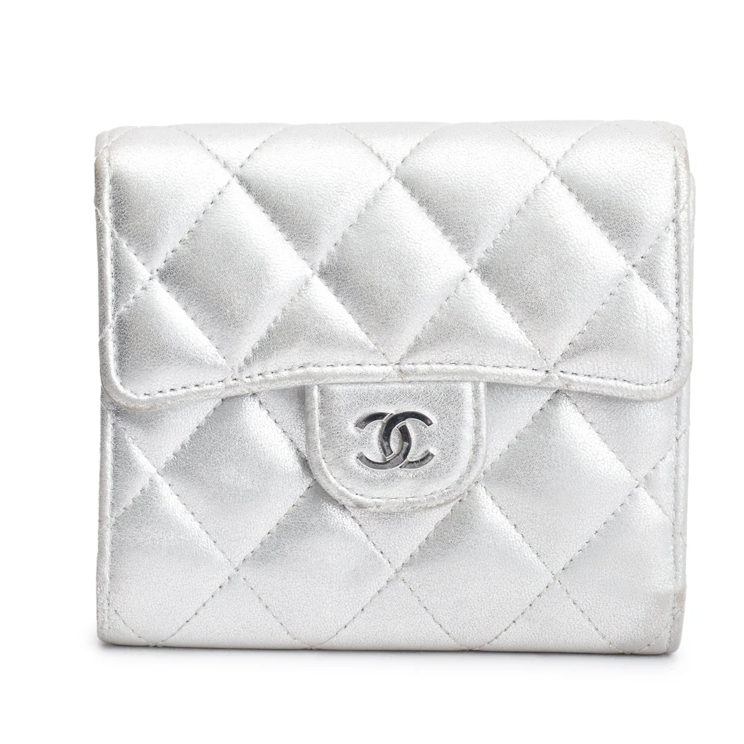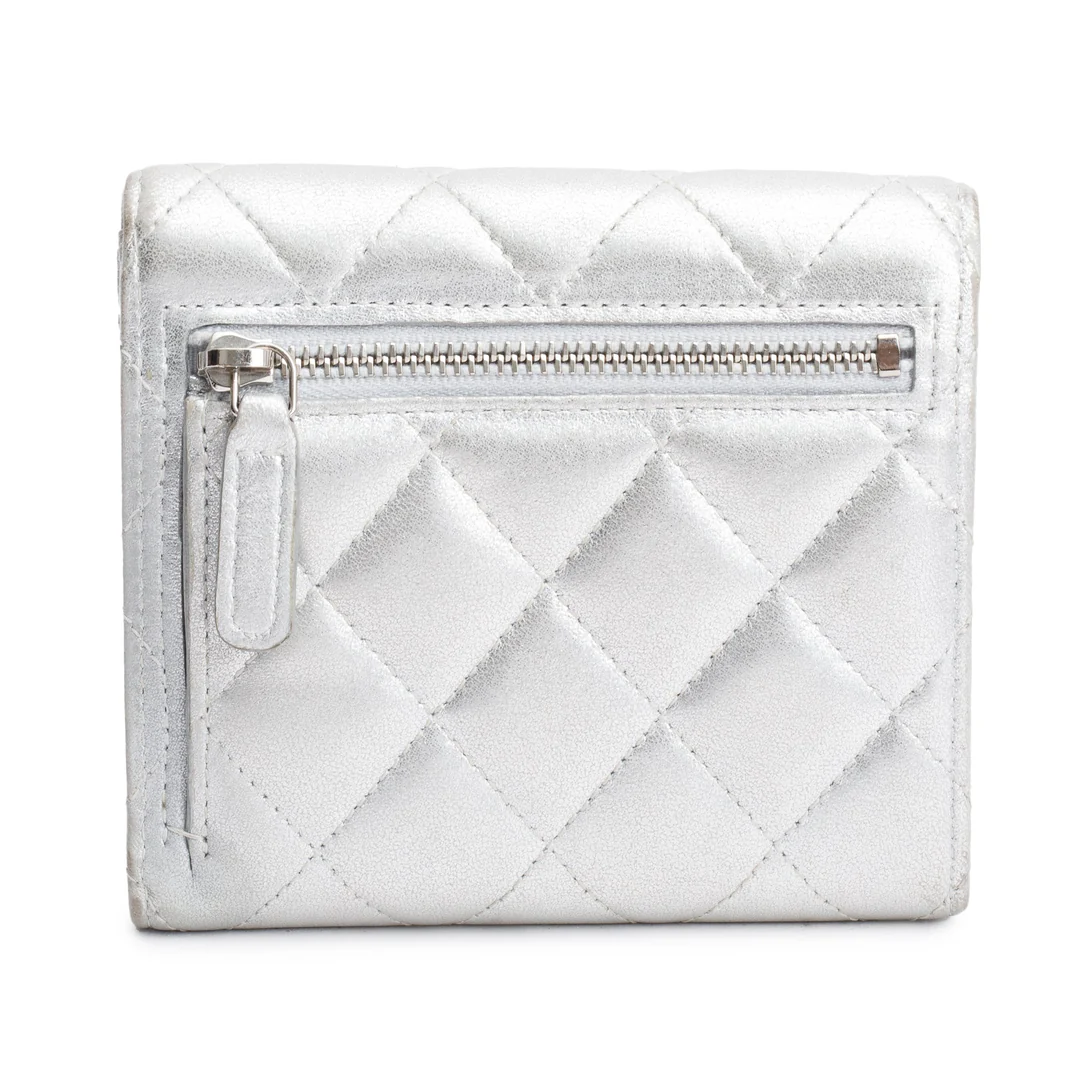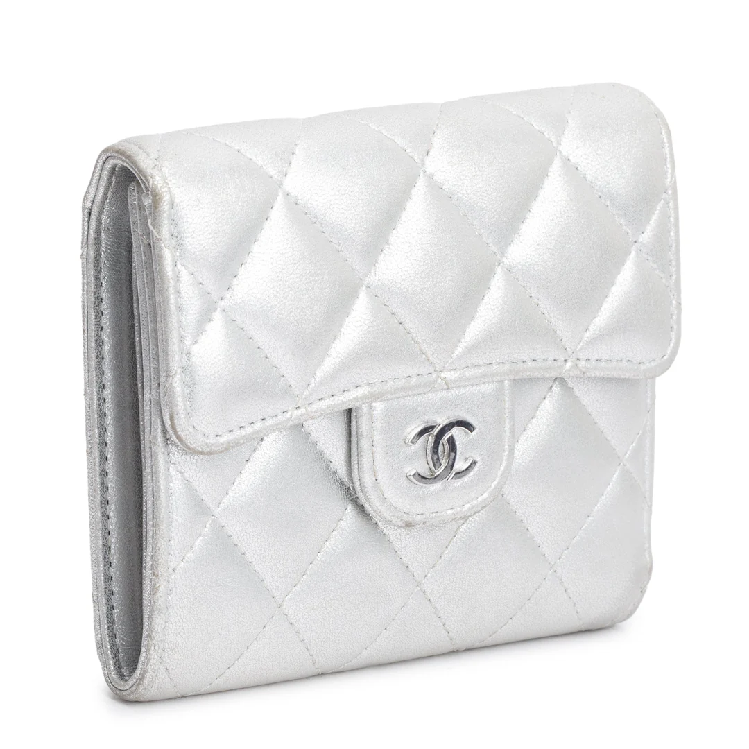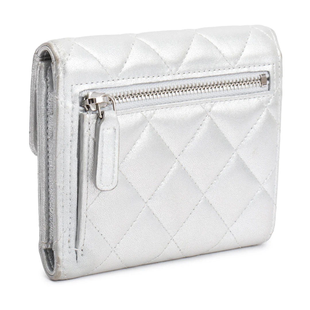 2021 Silver Metallic Quilted Lambskin Leather Compact Wallet