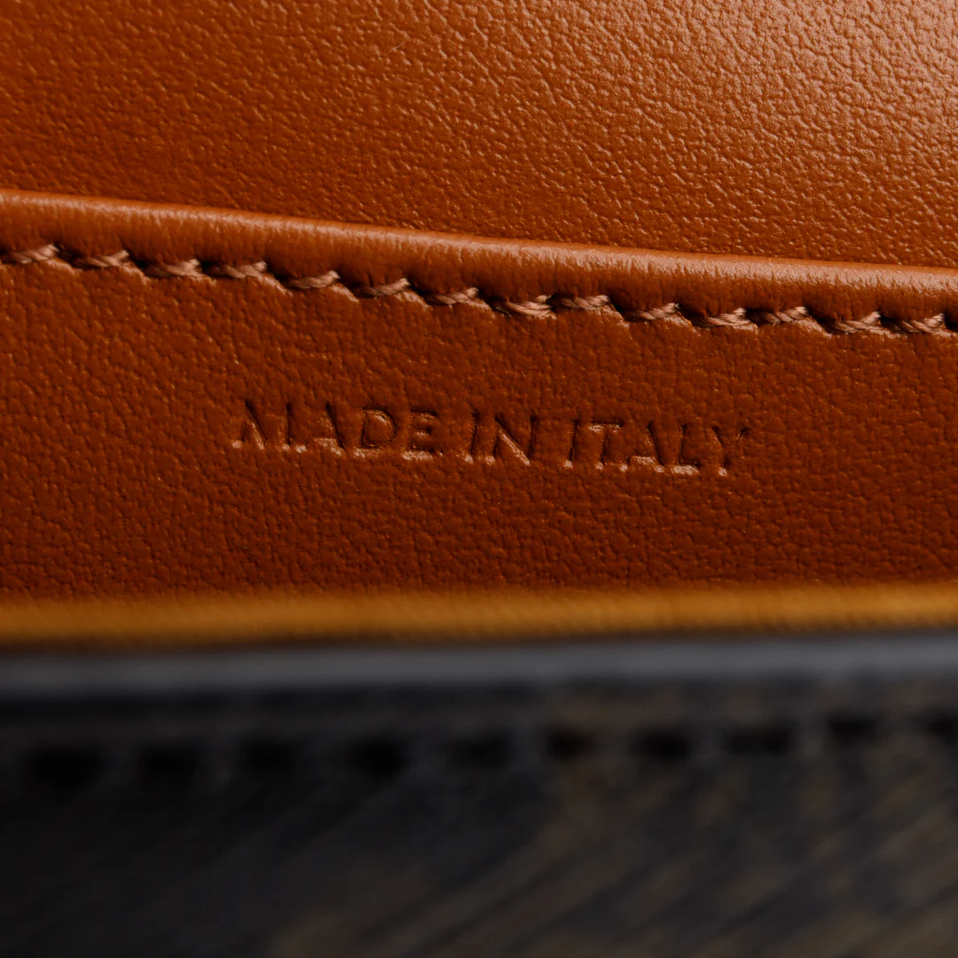 Condition: Very Good; minor scratches at hardware and indentations at interior flap; slight creasing at strap