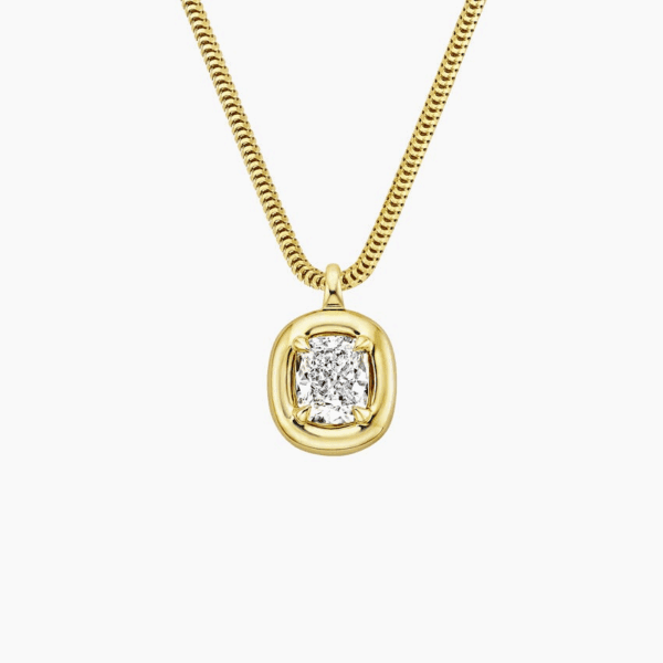 Blending form and function, this pendant necklace blends classic prongs with a bezel and solid basket, securing the cushion lab diamond center stone with a modern, eye-catching design. A snake chain completes the look with a sleek finish.