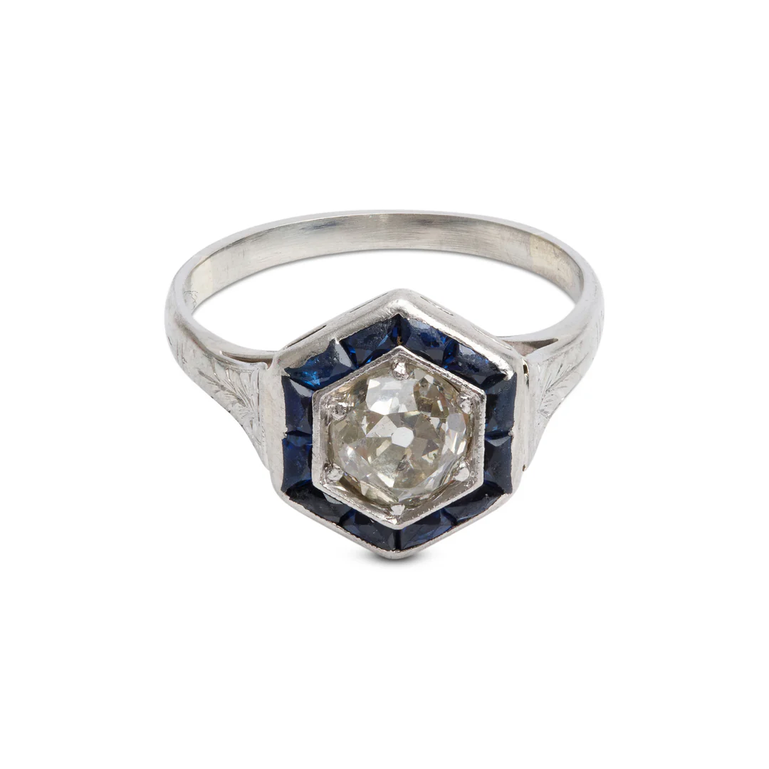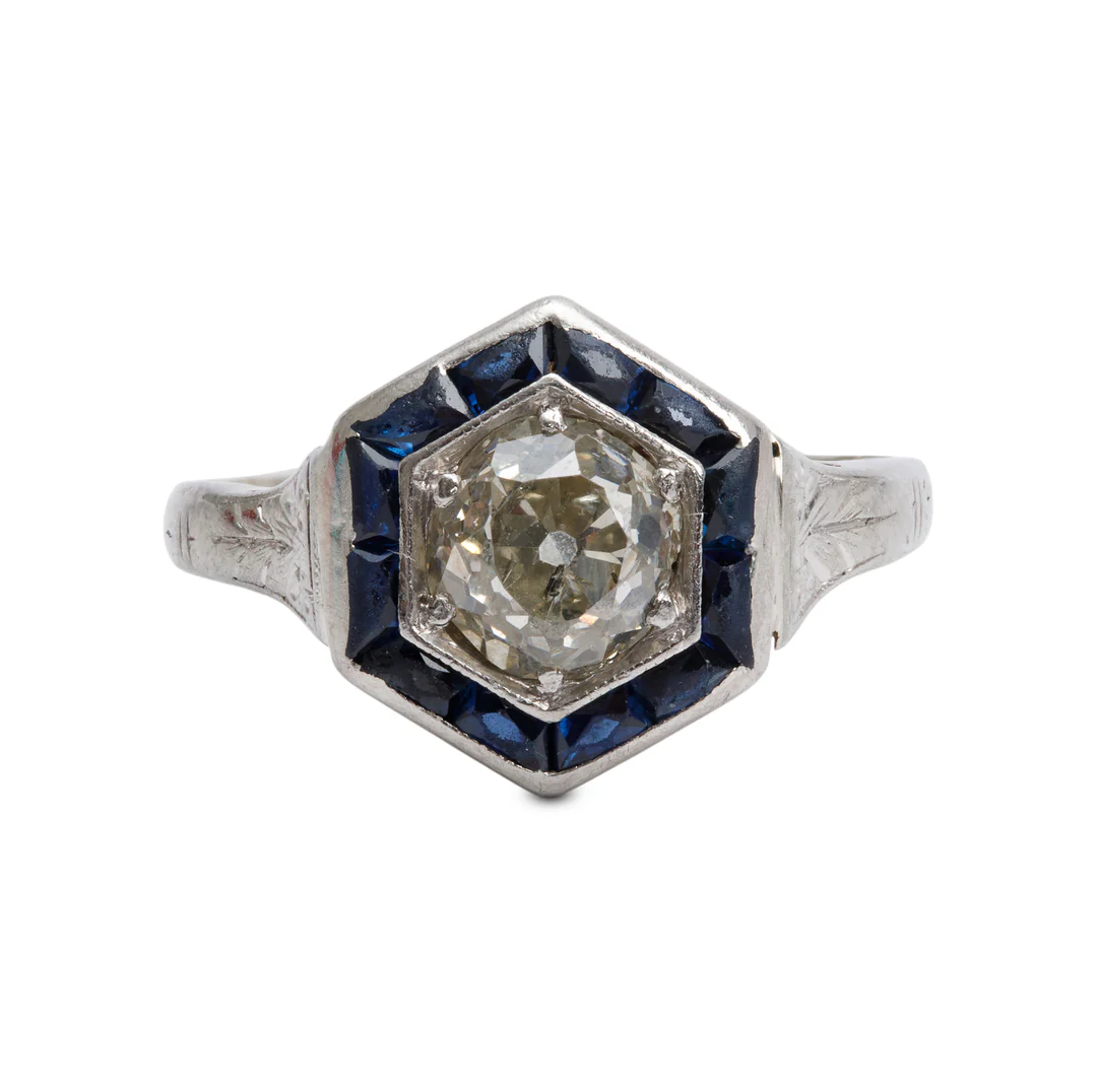 Antique 18k White Gold Sapphire & Diamond Hexagon Top Ring, Size 5