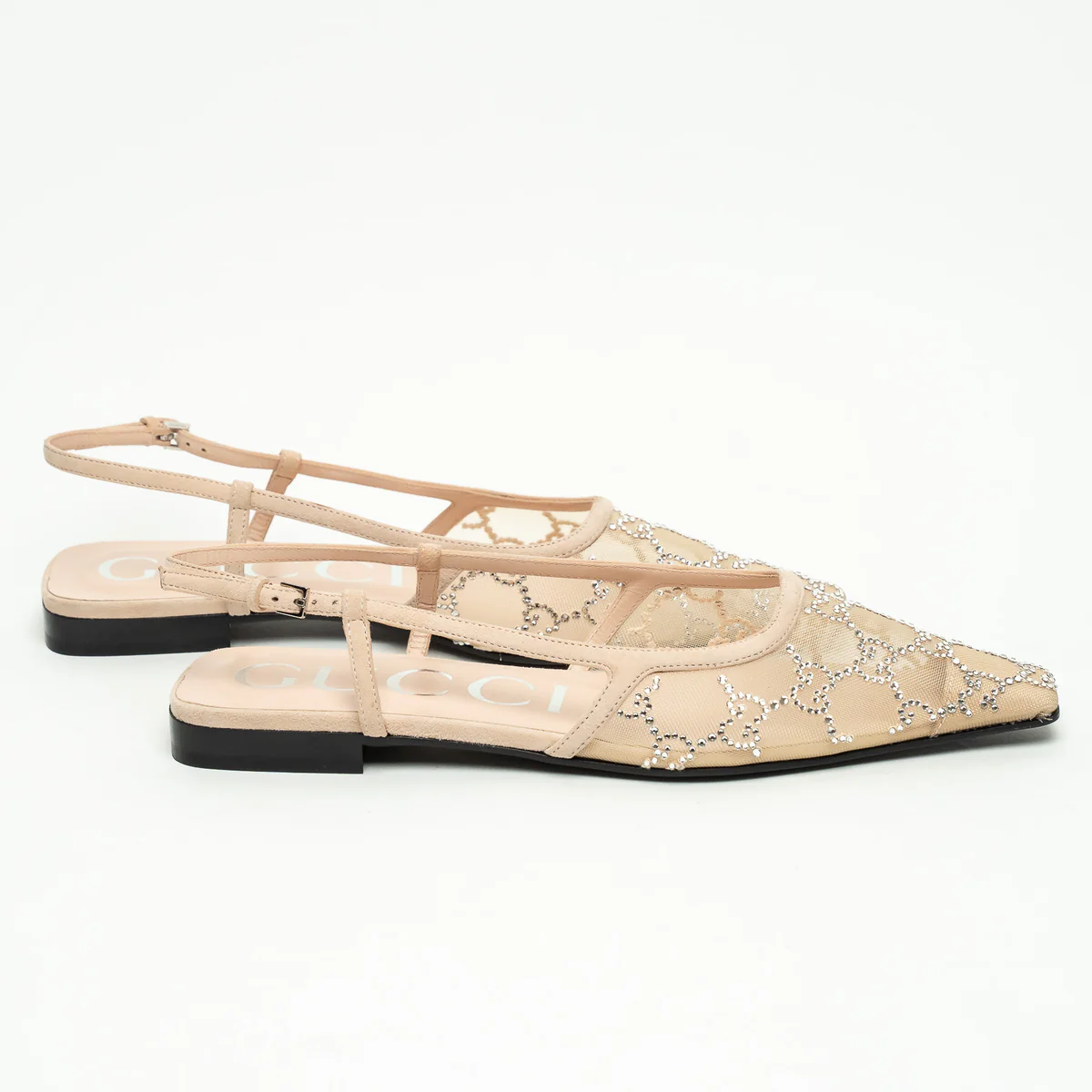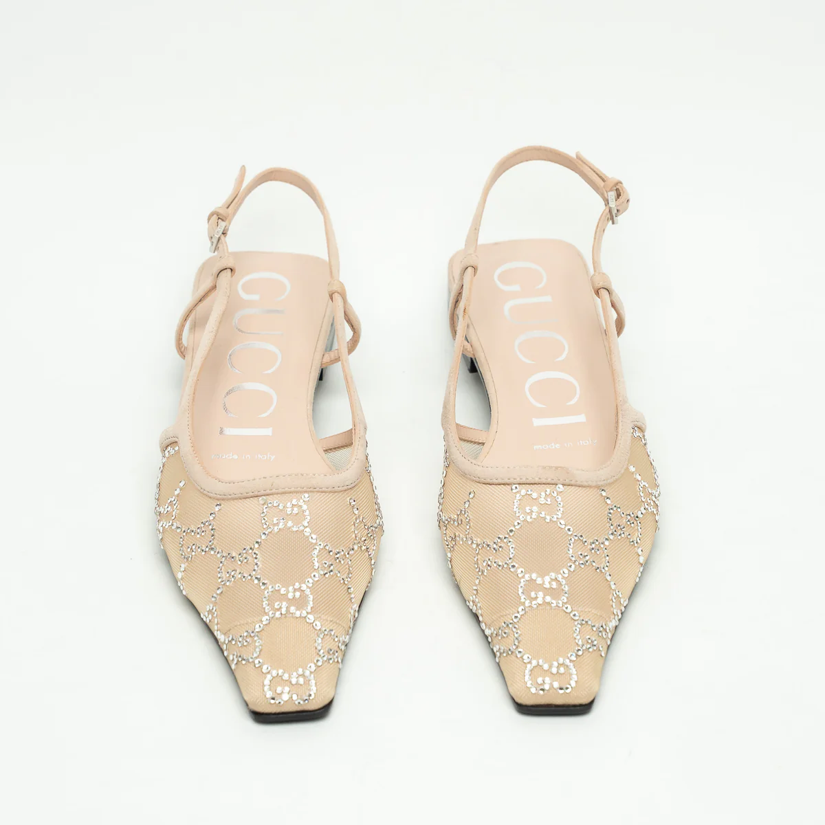 - Features: Crystal GG, Pointed square toe, Mesh front, Leather insole