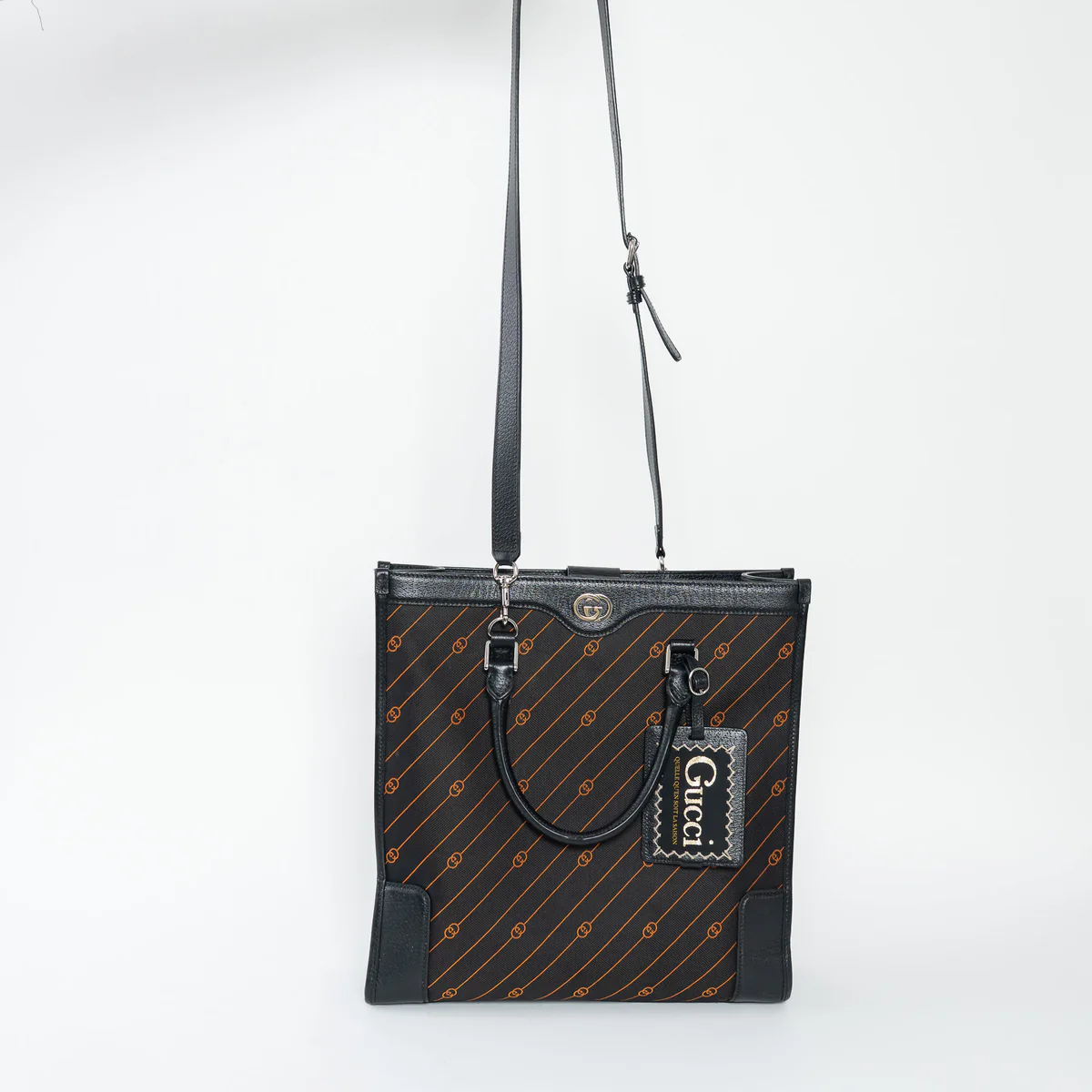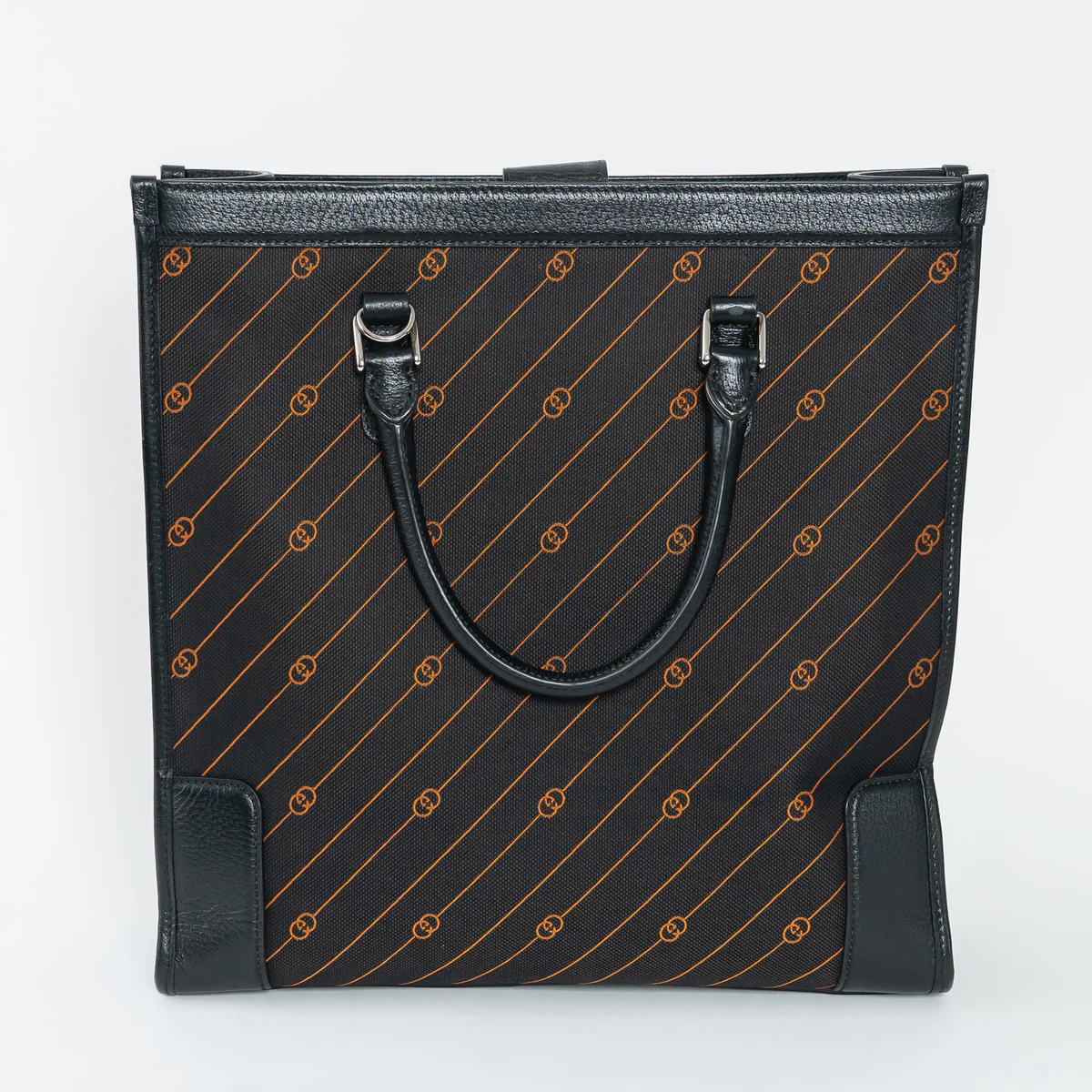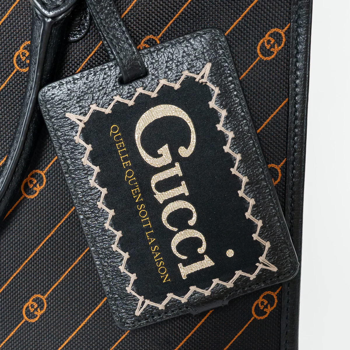 - Exterior Features: Black leather trim, Two leather top handles, Magnetic clasp, Removeable adjustable leather strap, Leather luggage tag with snap button , Silver interlocking GG logo