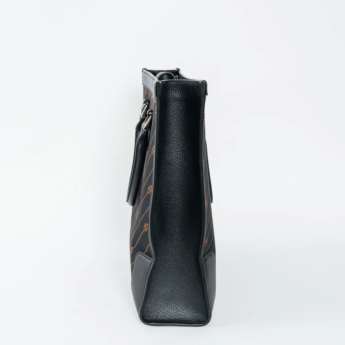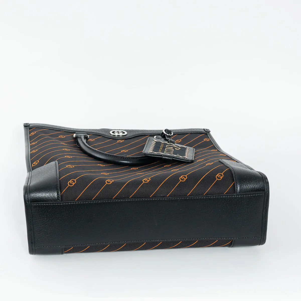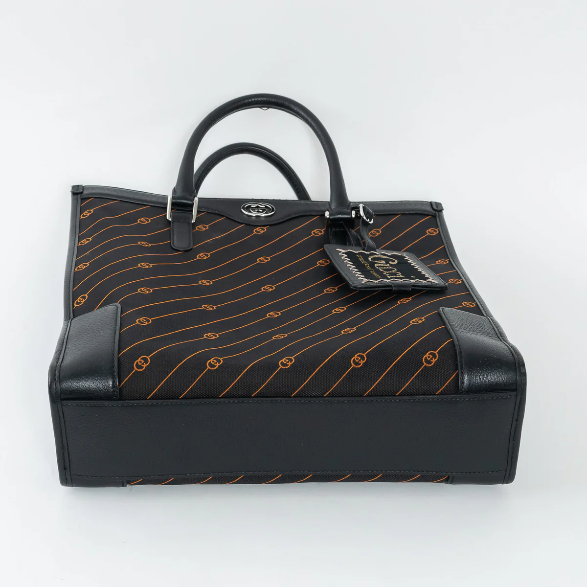 - Exterior Features: Black leather trim, Two leather top handles, Magnetic clasp, Removeable adjustable leather strap, Leather luggage tag with snap button , Silver interlocking GG logo