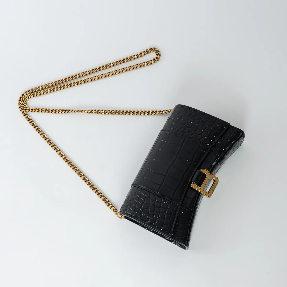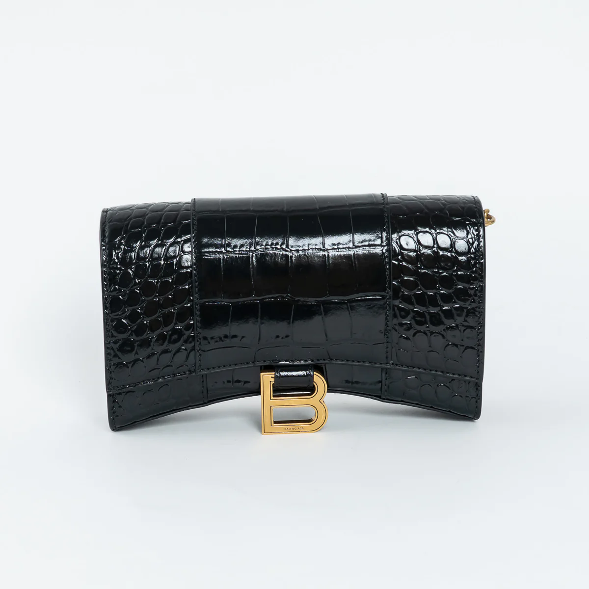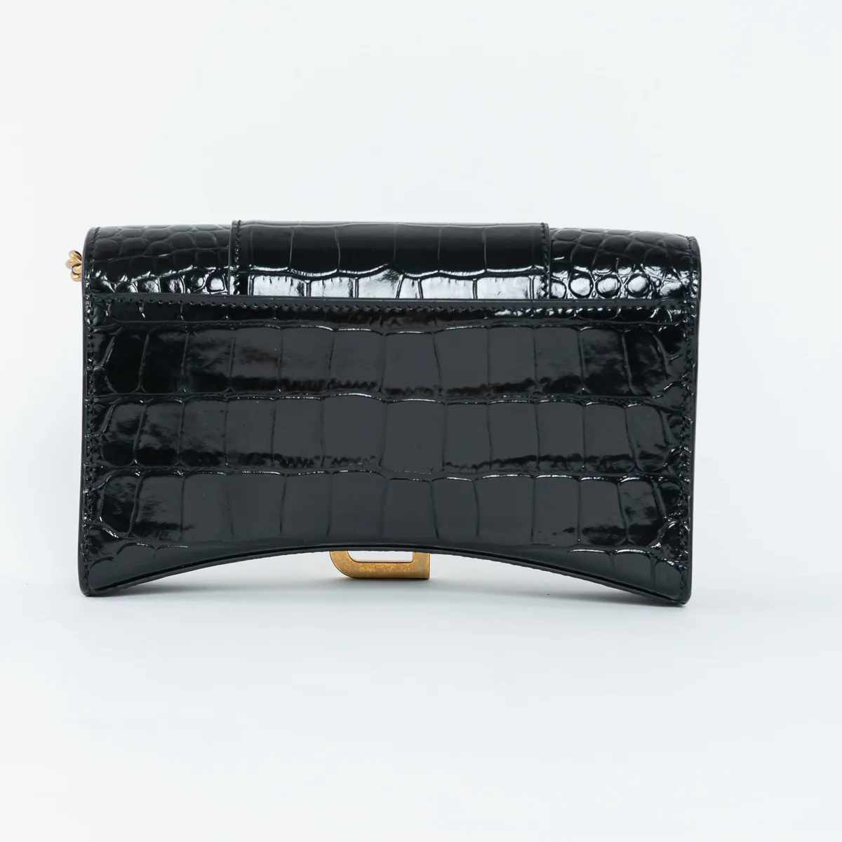 Black Embossed Croc Calfskin Leather Hourglass Wallet on Chain