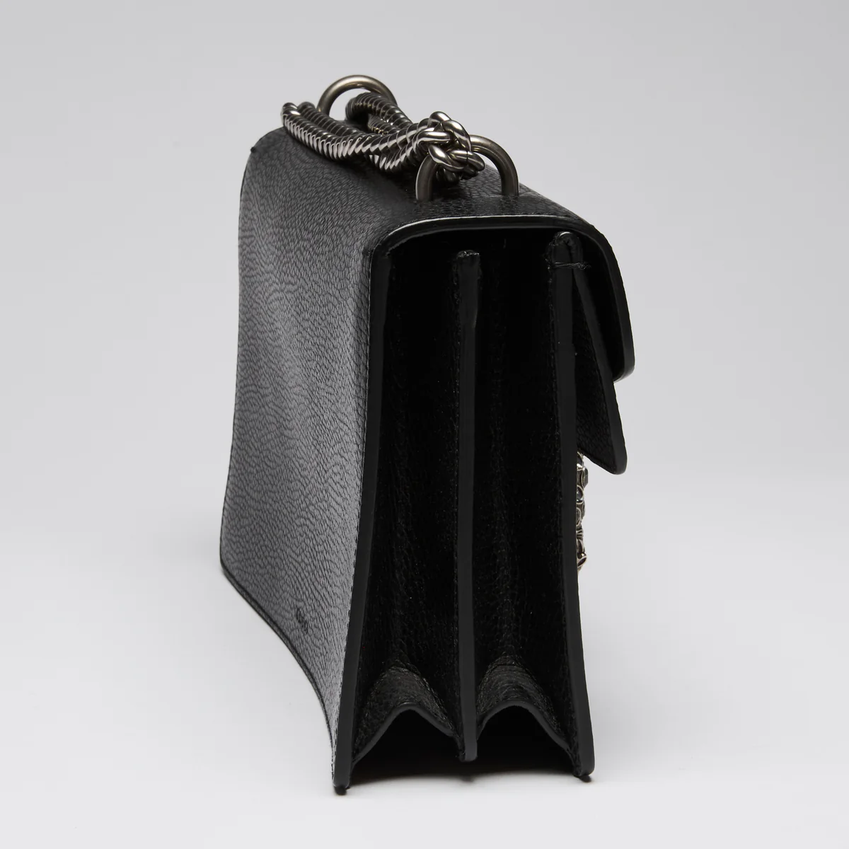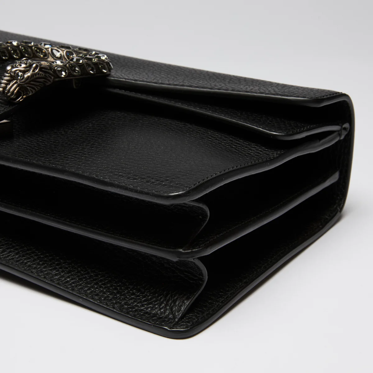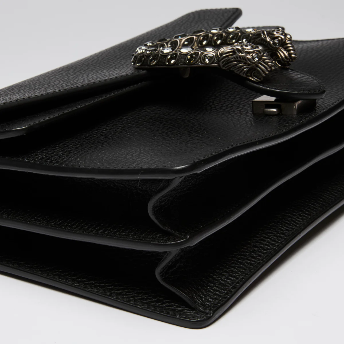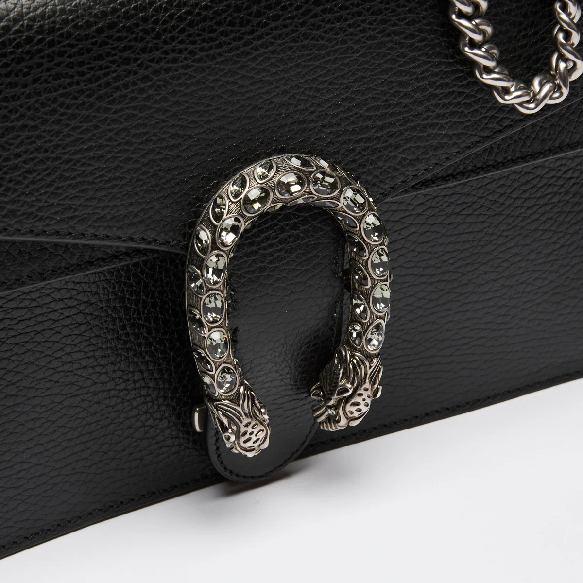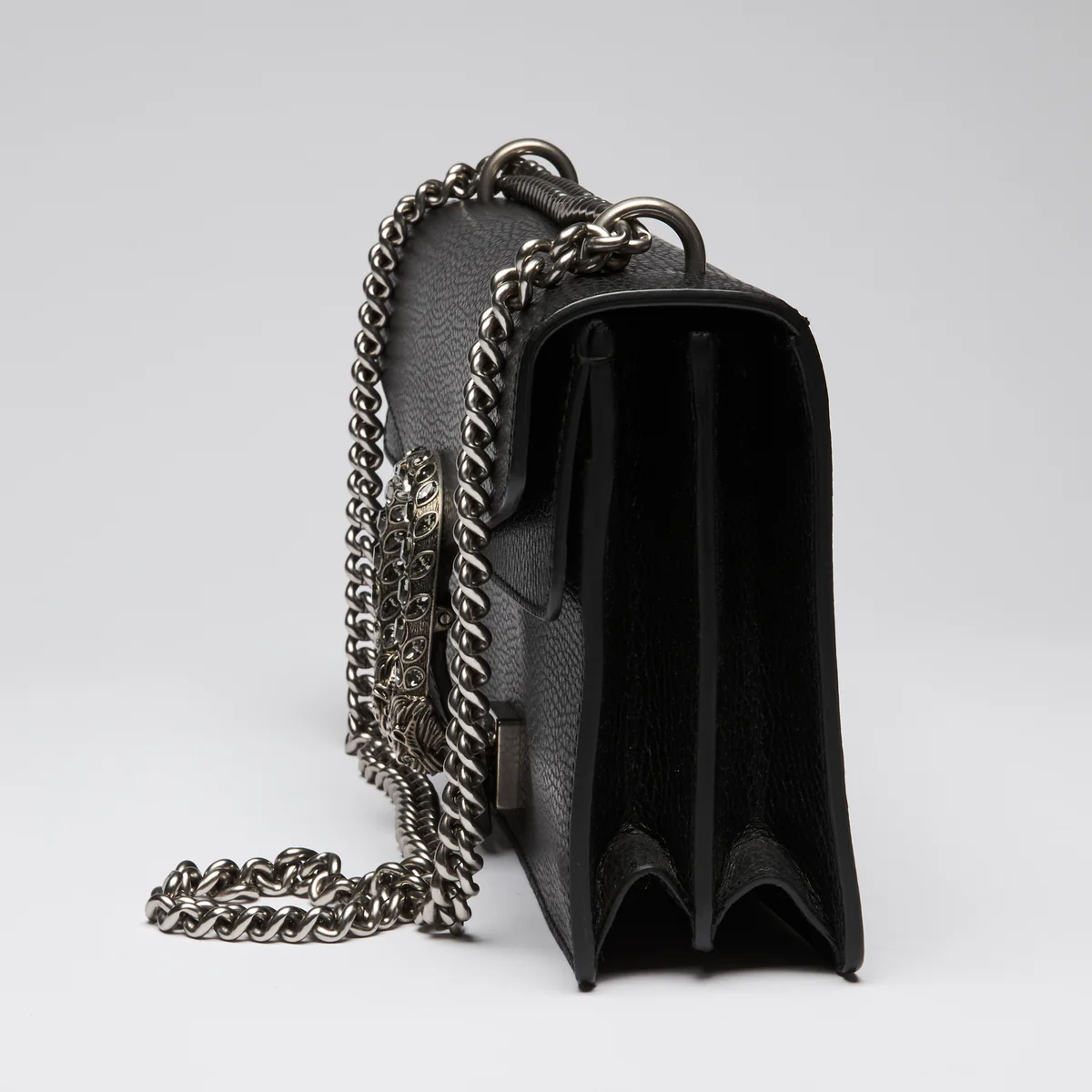 - Exterior Features: Tiger Head Spur with Crystals, Push Lock Closure, Single Flap, Chain Strap, Two Leather Gussets
