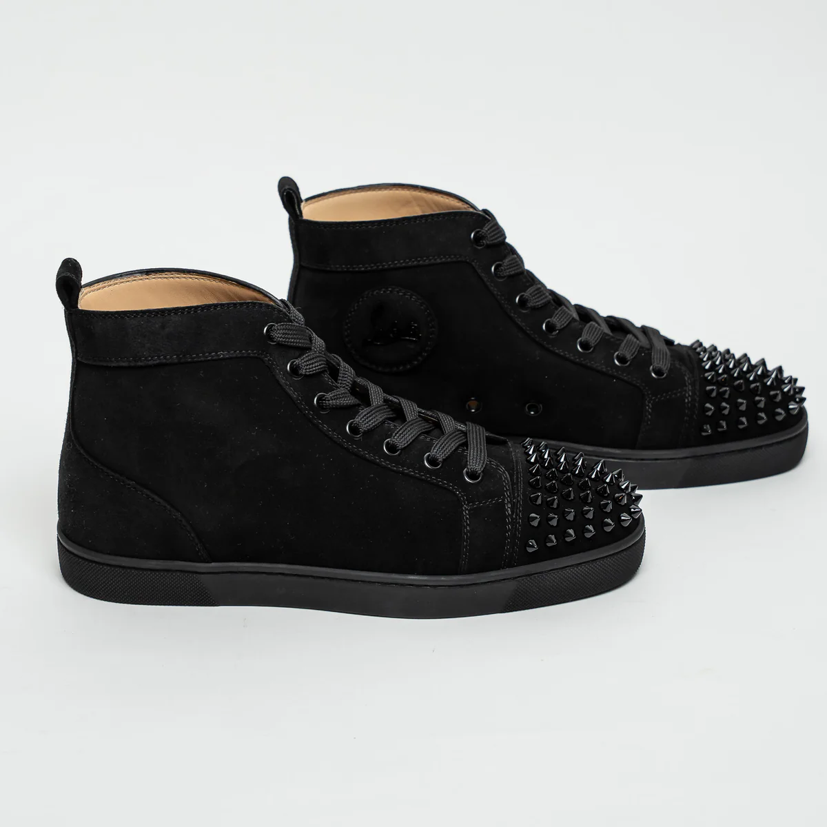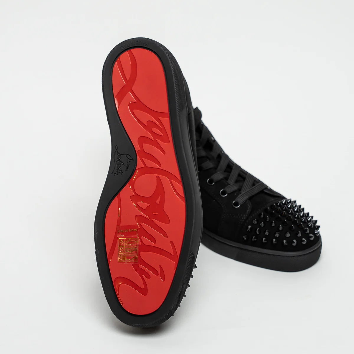 - Details: Toe box embellished with signature spikes, Leather insole, Signature Christian Louboutin red soles, Silver hardware logo on side