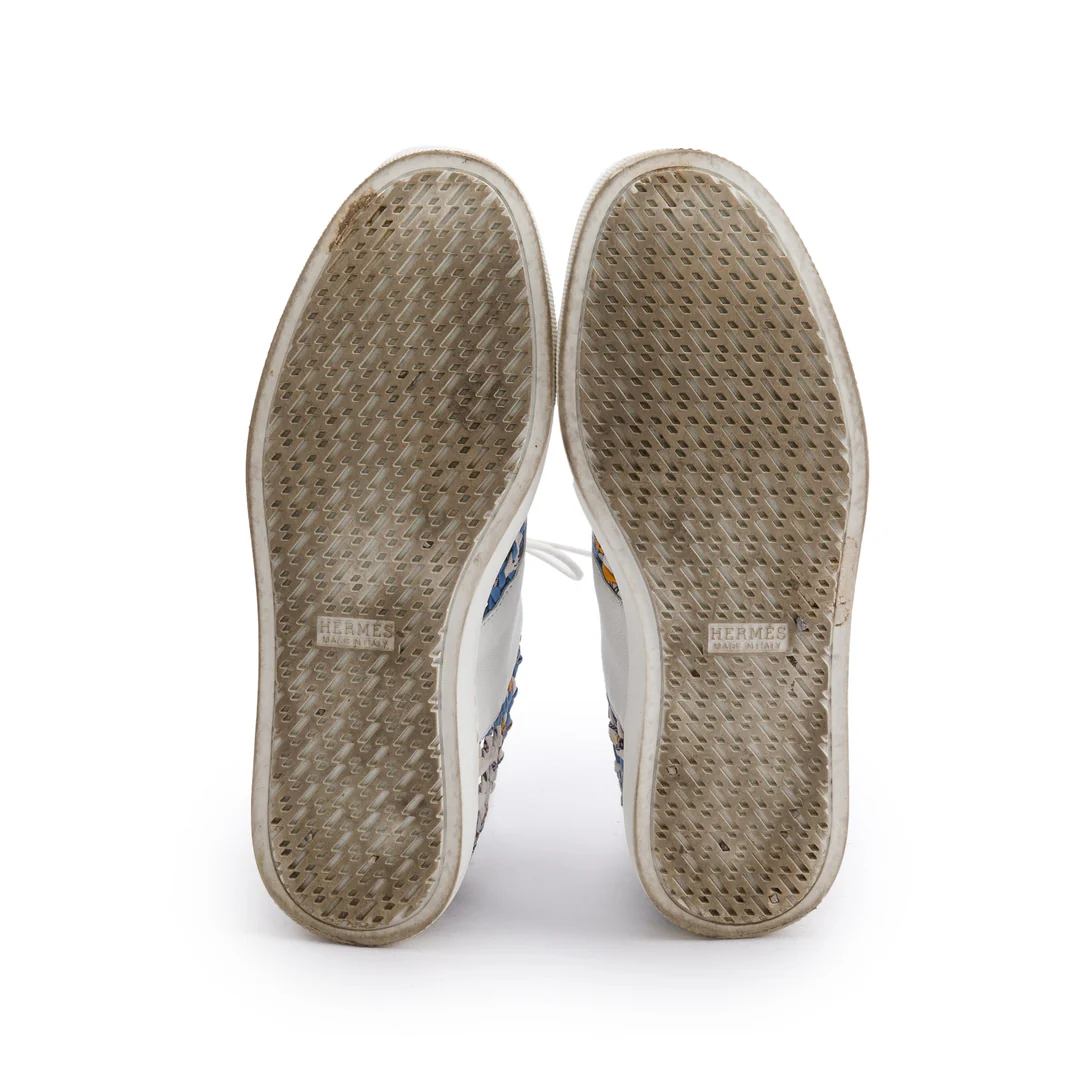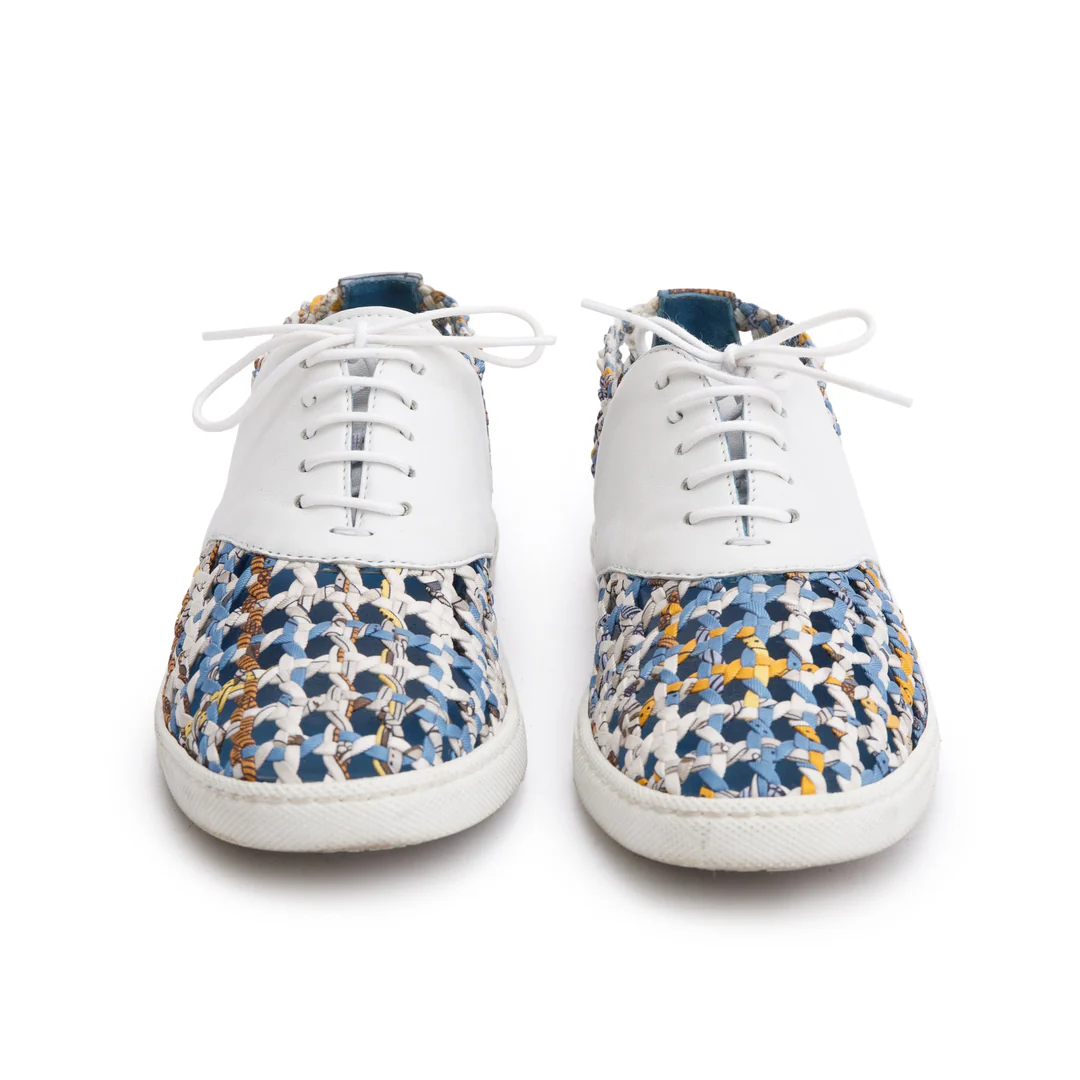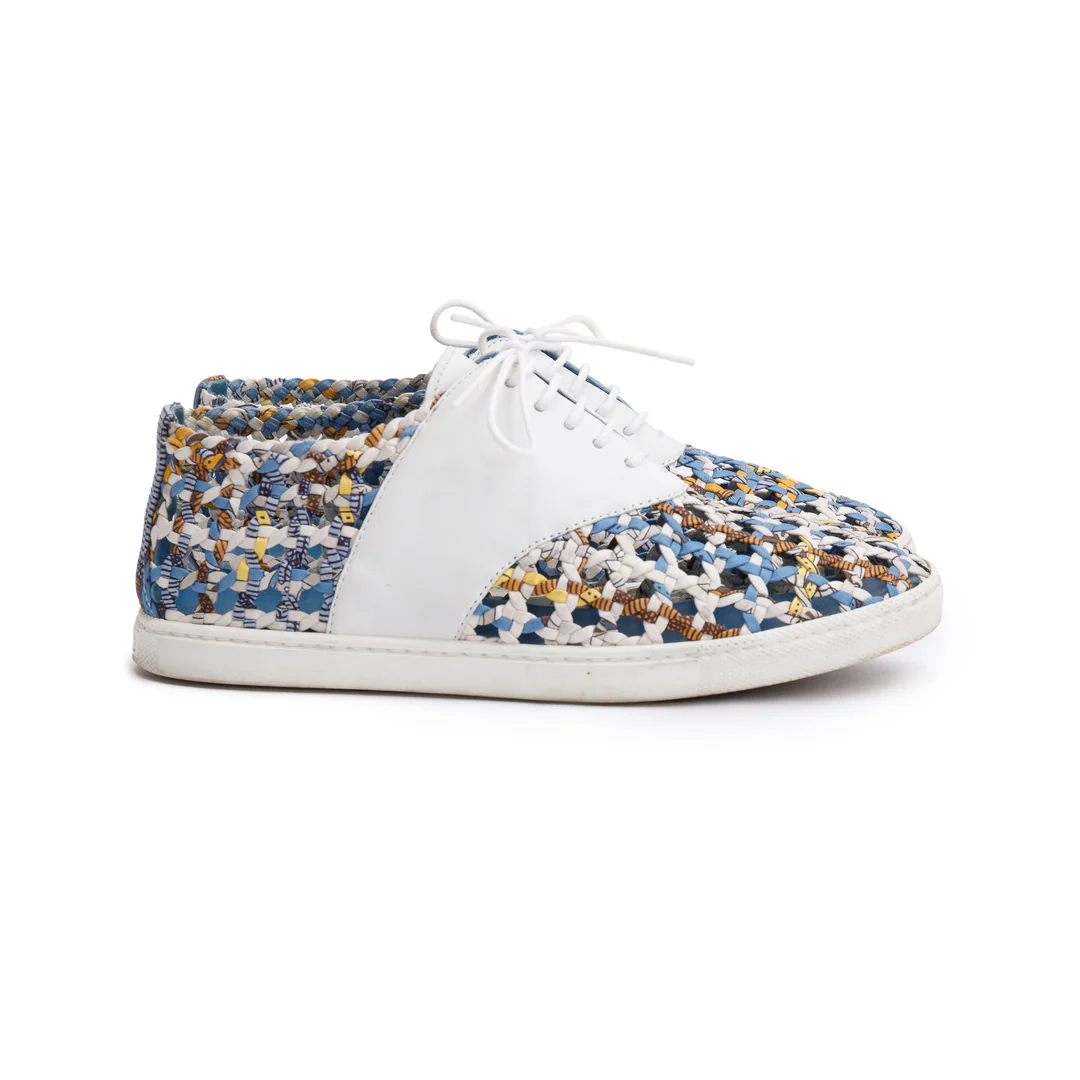 Blue Multicolor Animal Print Braided Silk White Leather Sneakers, Size 35.5