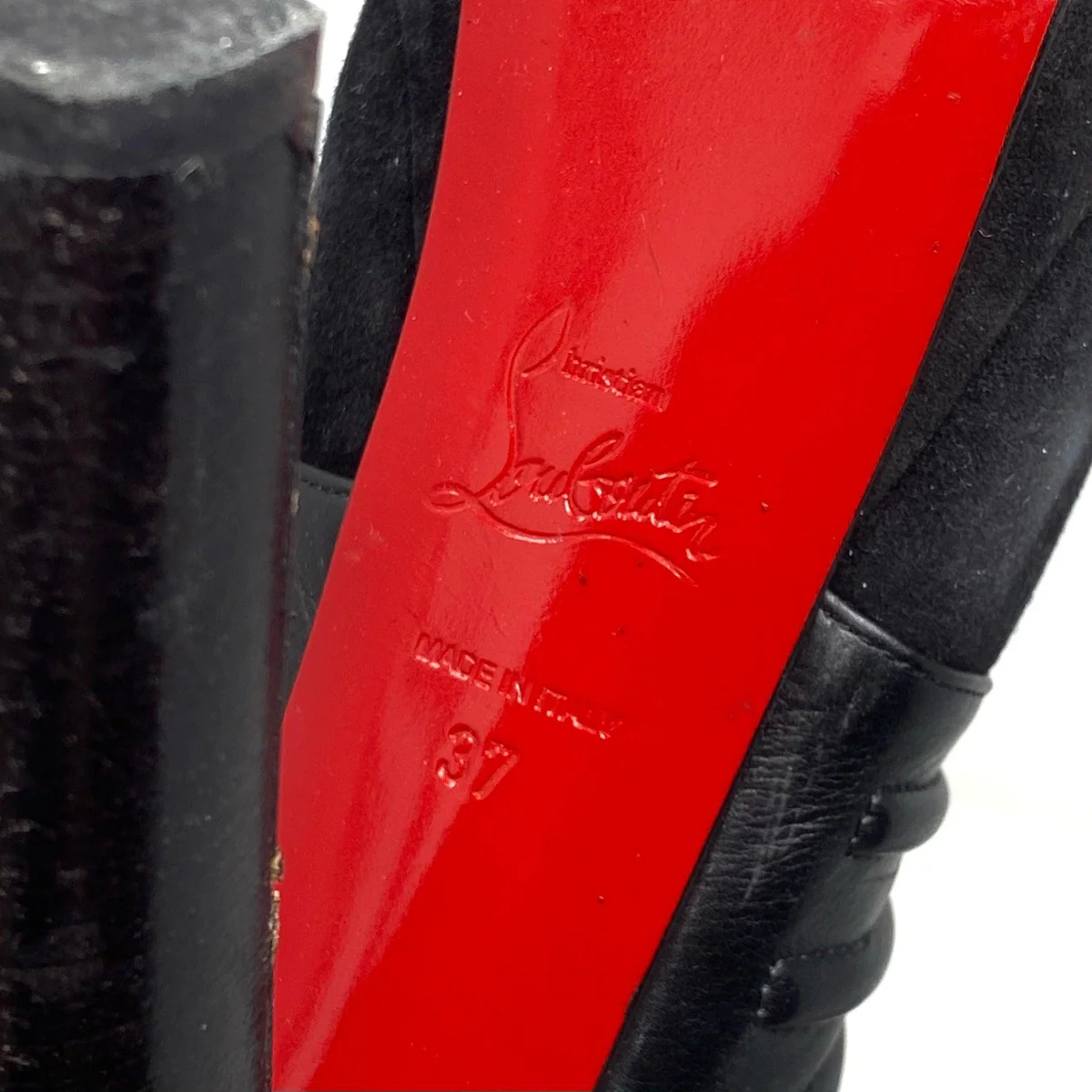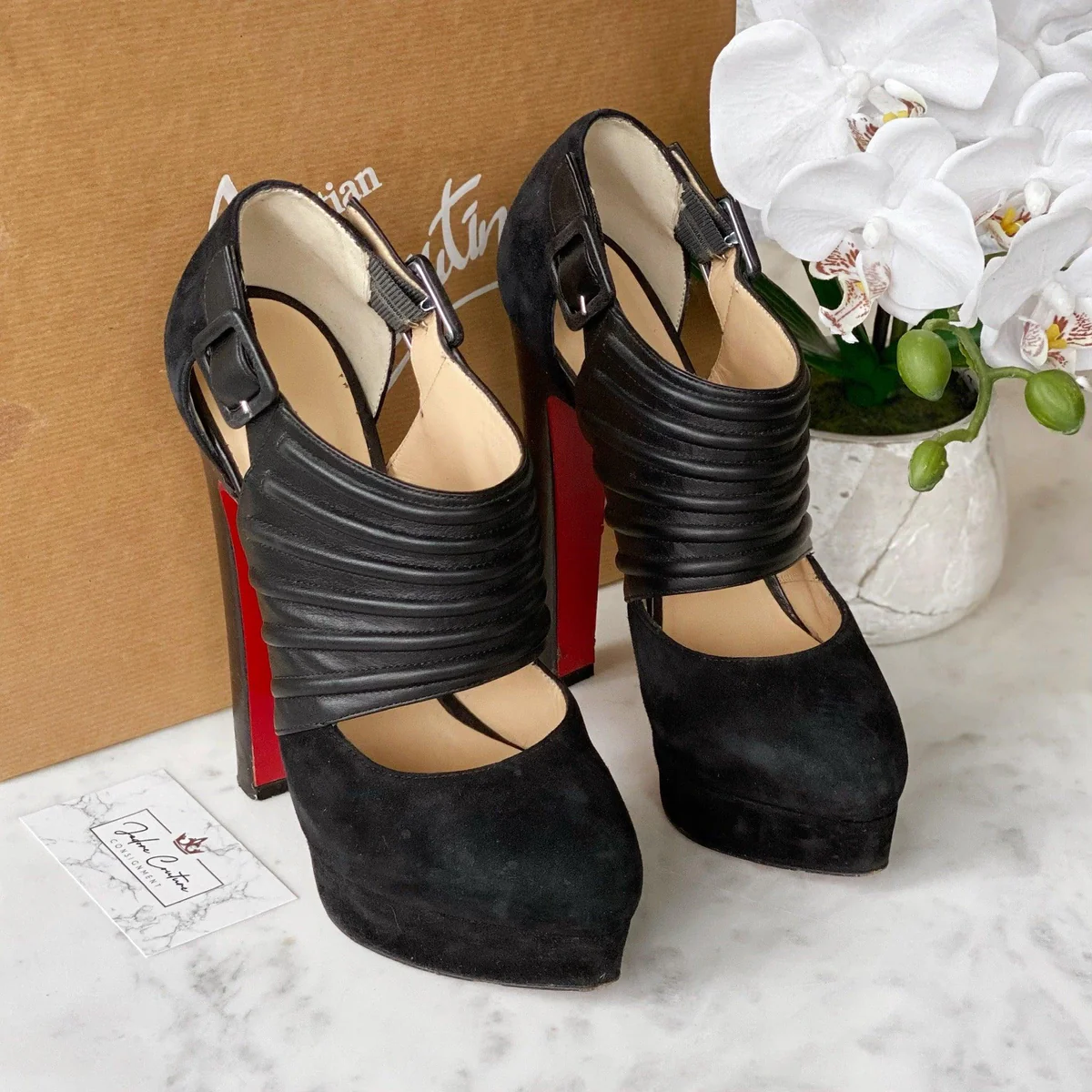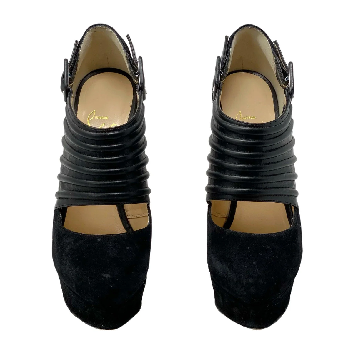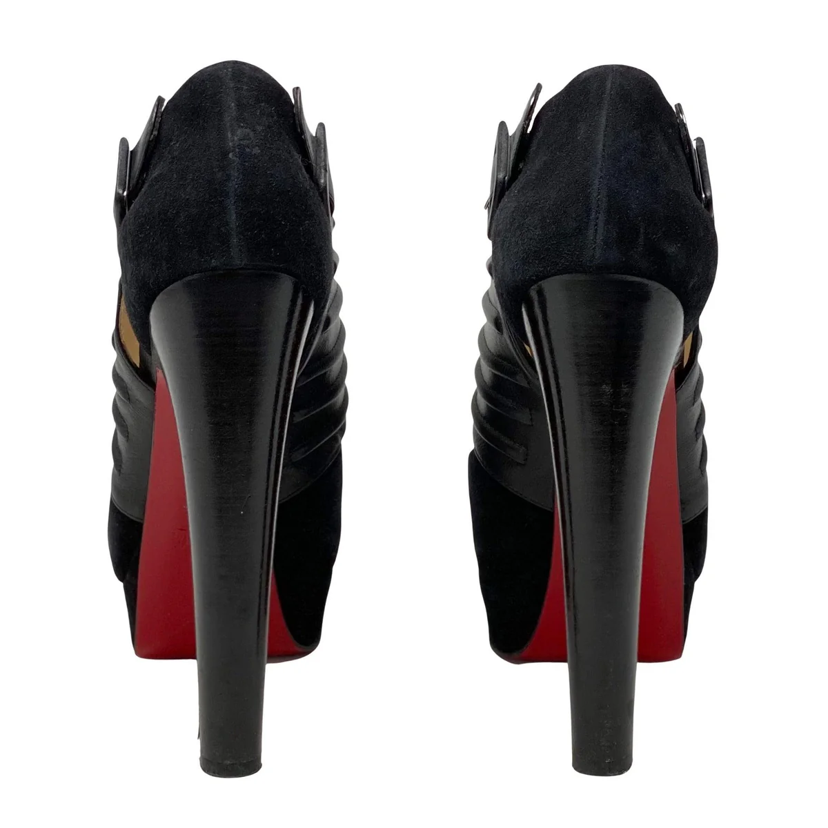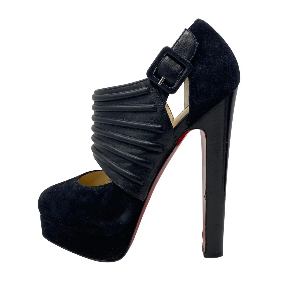 Christian Louboutin Bye Bye booties in black suede and leather upper featuring buckle detail.