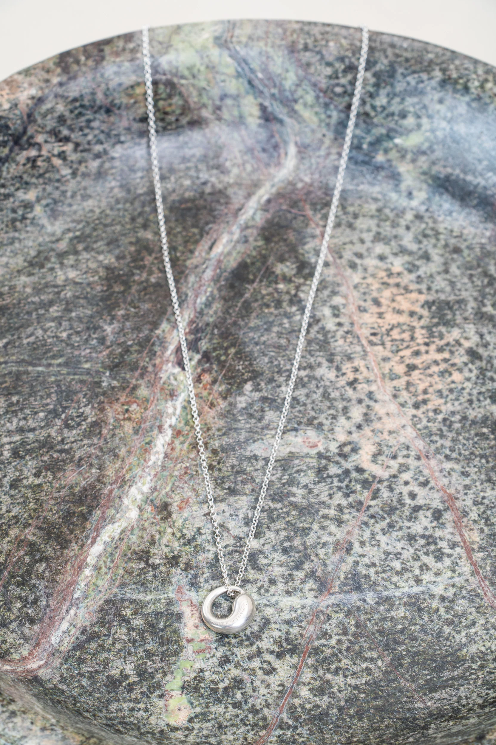 This Tiffany & Co. Eternal Circle Necklace showcases a polished sterling silver circle pendant suspended from a delicate chain. The continuous loop symbolizes eternity and enduring style. With its refined finish and versatile length, this piece is a graceful addition to any jewelry collection.