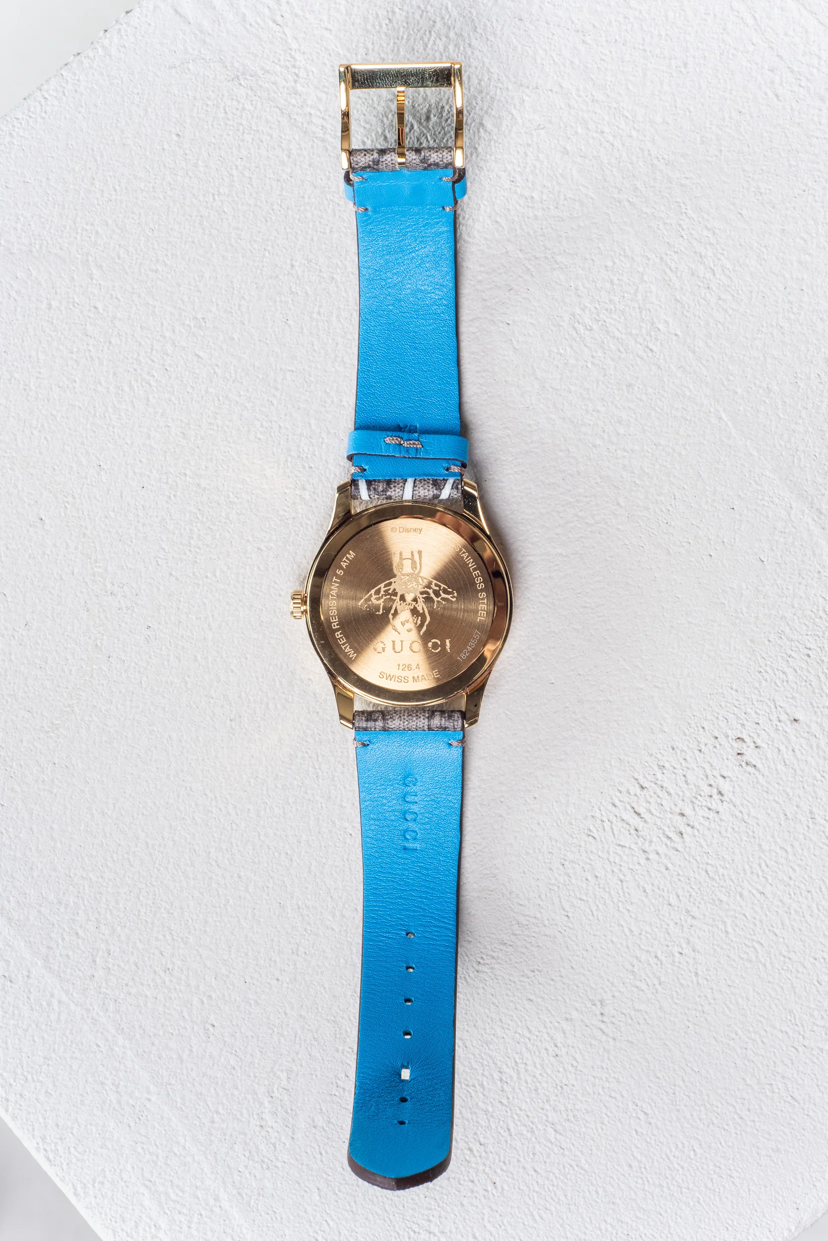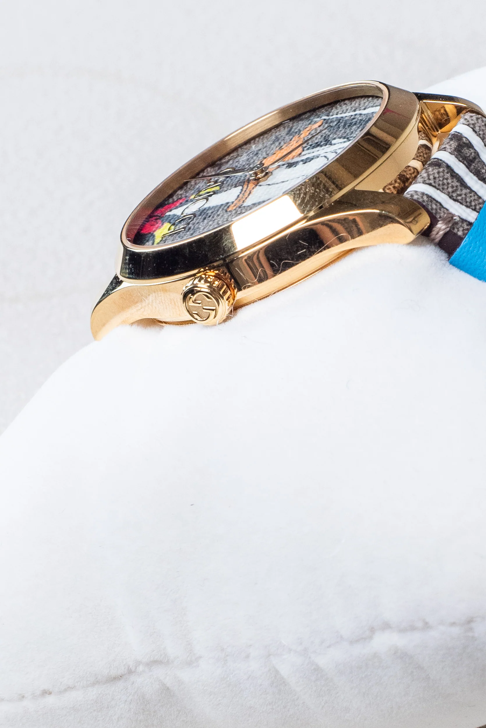 This pre-owned Gucci G-Timeless Disney Donald Duck Watch showcases a vibrant, character-filled design that merges Gucci’s signature craftsmanship with Disney’s whimsical spirit. Featuring a multicolour dial and coated canvas strap with leather detailing, this watch delivers a bold statement while staying true to timeless style. A standout piece for collectors and everyday wearers alike.