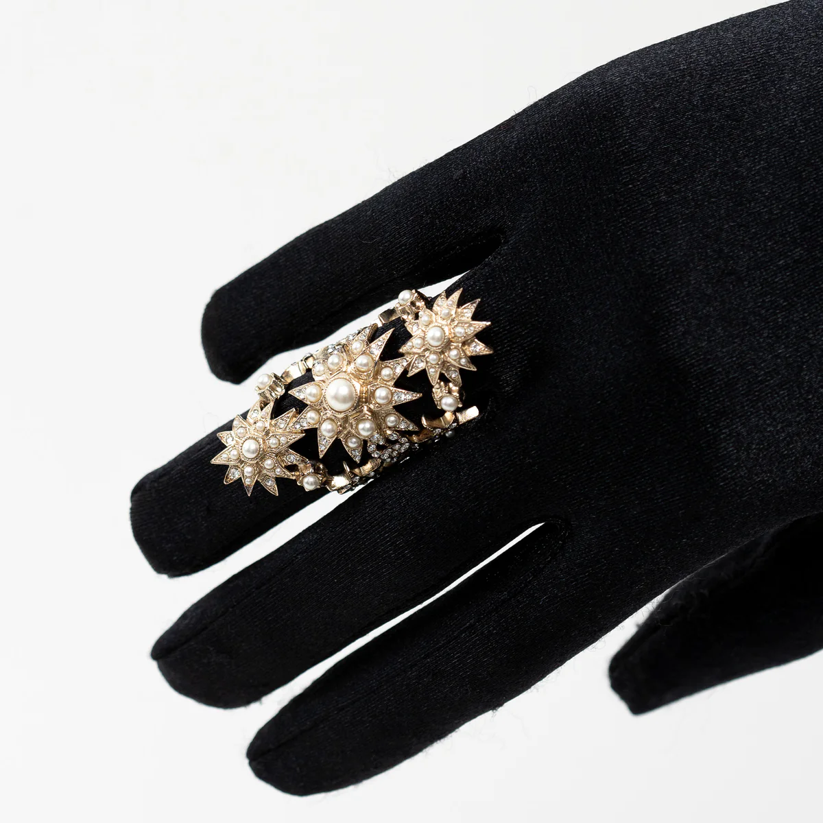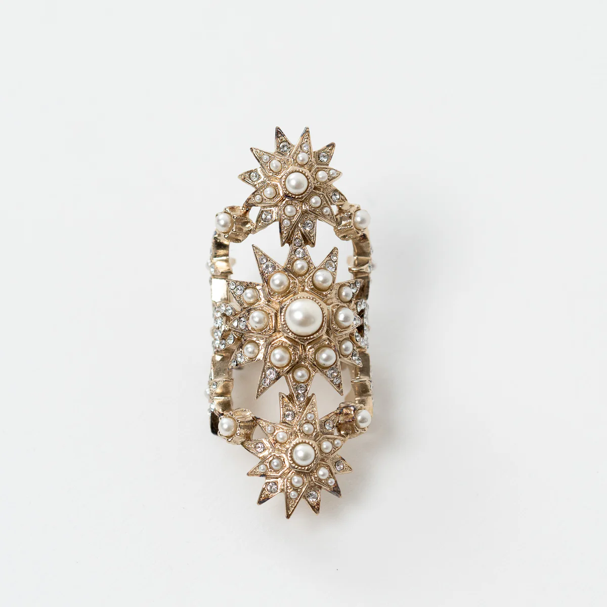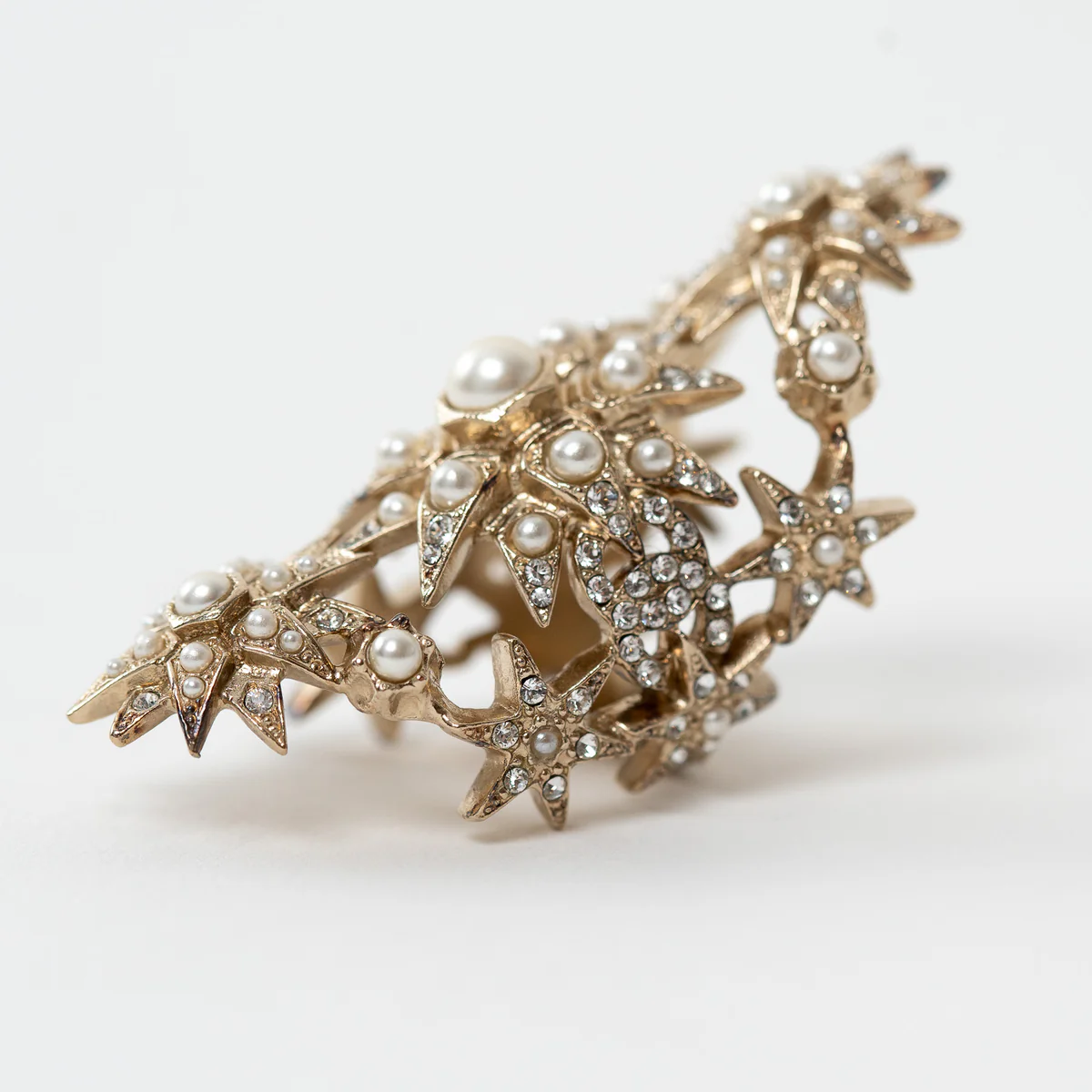 - Features: Seven star embellished with faux pearls and crystals, interlocking crystal embellished logos on both sides of central star