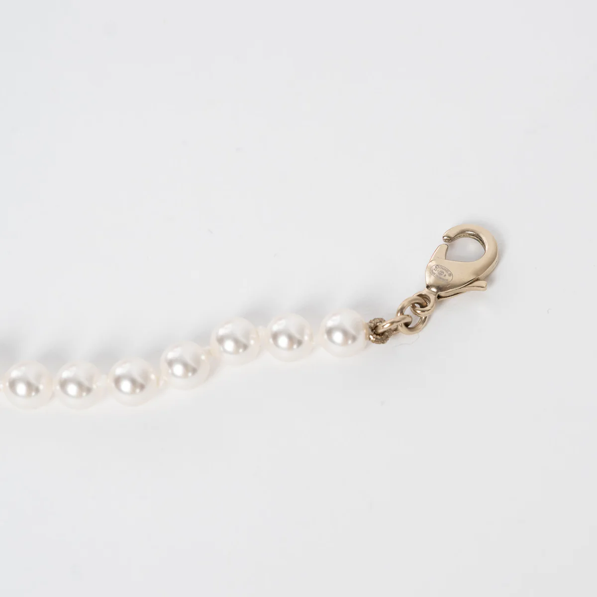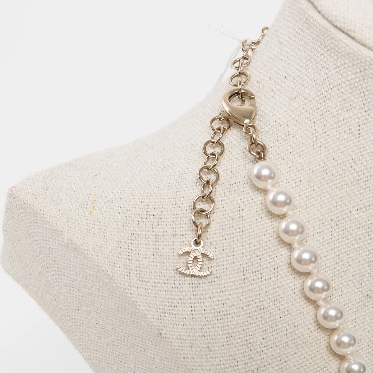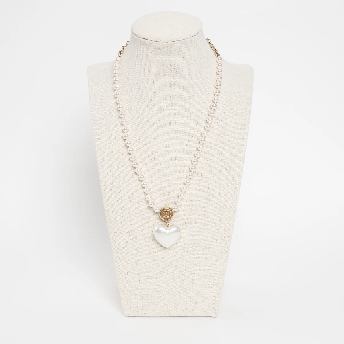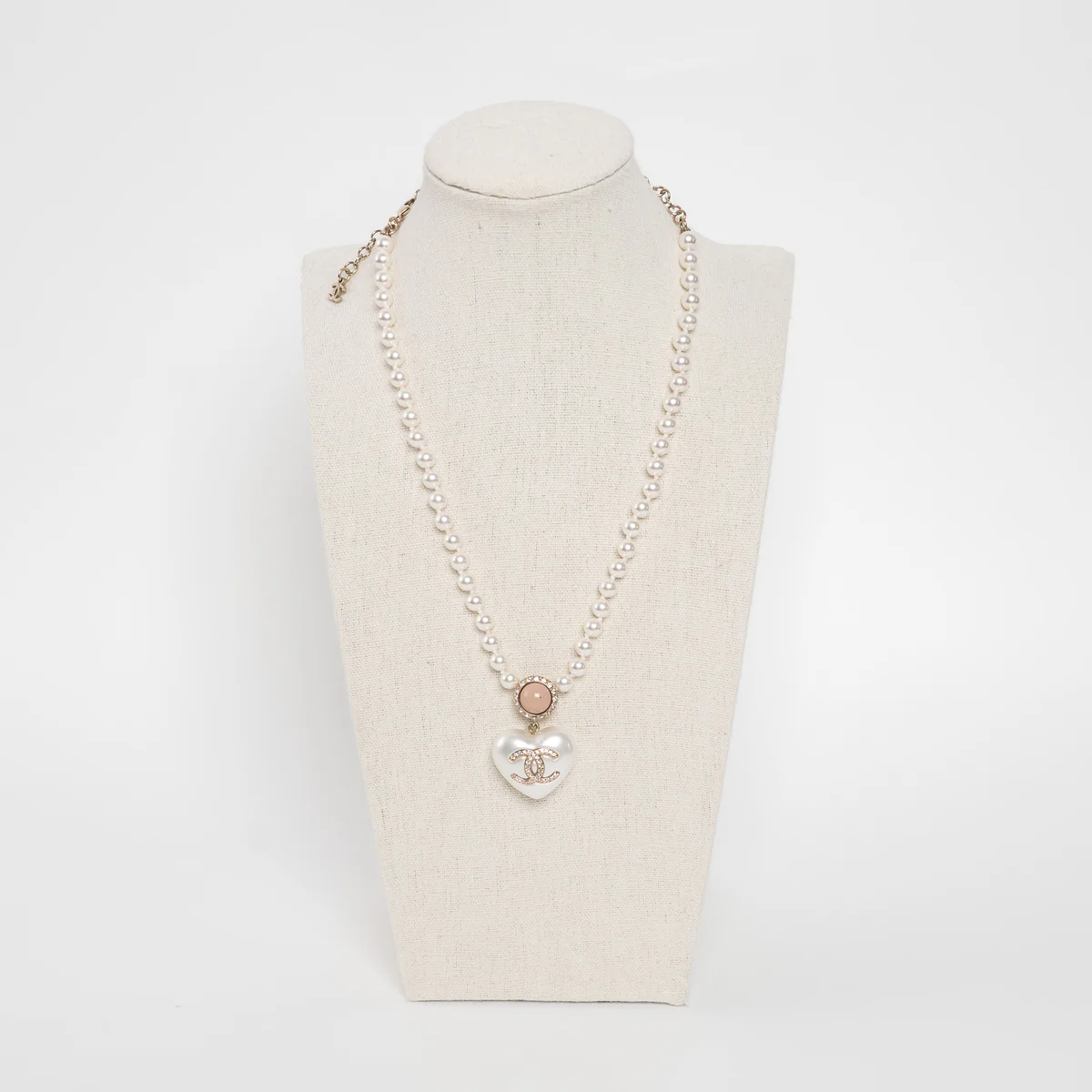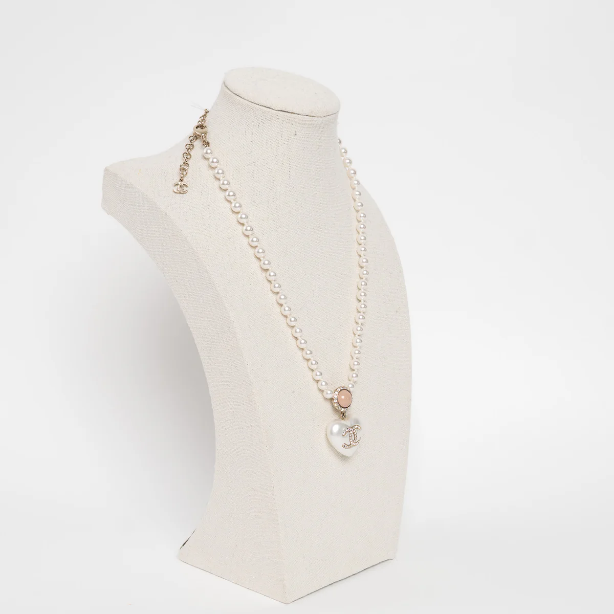 • Features: Gold Tone Interlocking Letter Logo Pendant Necklace atop faux pearl heart pendant, Adjustable Pearl Chain with a Lobster Claw Clasp, pink inset detail surrounded by silver crystals