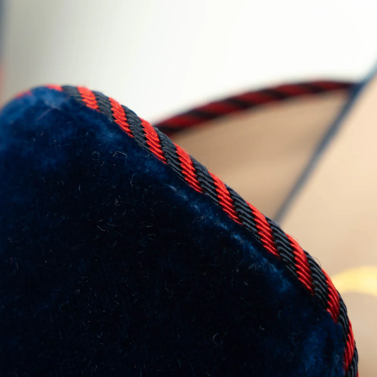 - Details: Blue velvet outer, smooth leather lined, red corded details