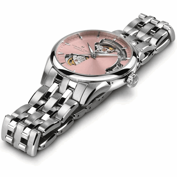 The 36mm Jazzmaster Open Heart demonstrates a perfect balance of classic appearance and innovative craftsmanship. Inspired by the freshness of flowers in bloom, this stainless steel version boasts a dial with a precise cut-out design dressed in subtle pink for feminine flair and crisp style.