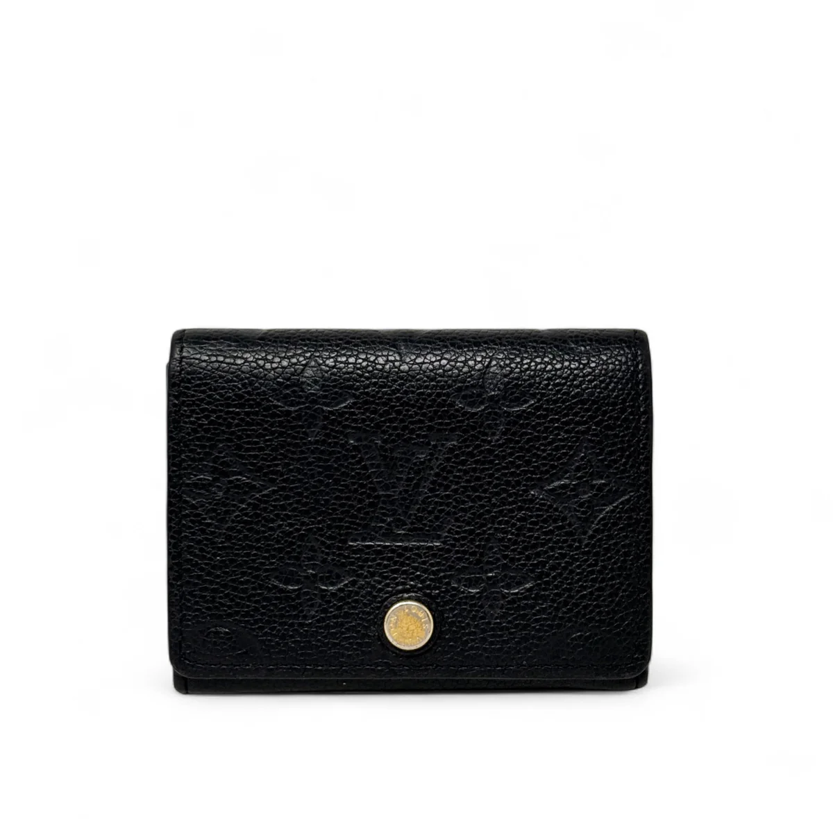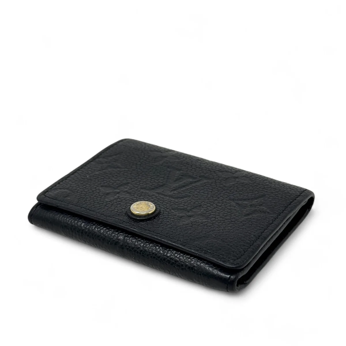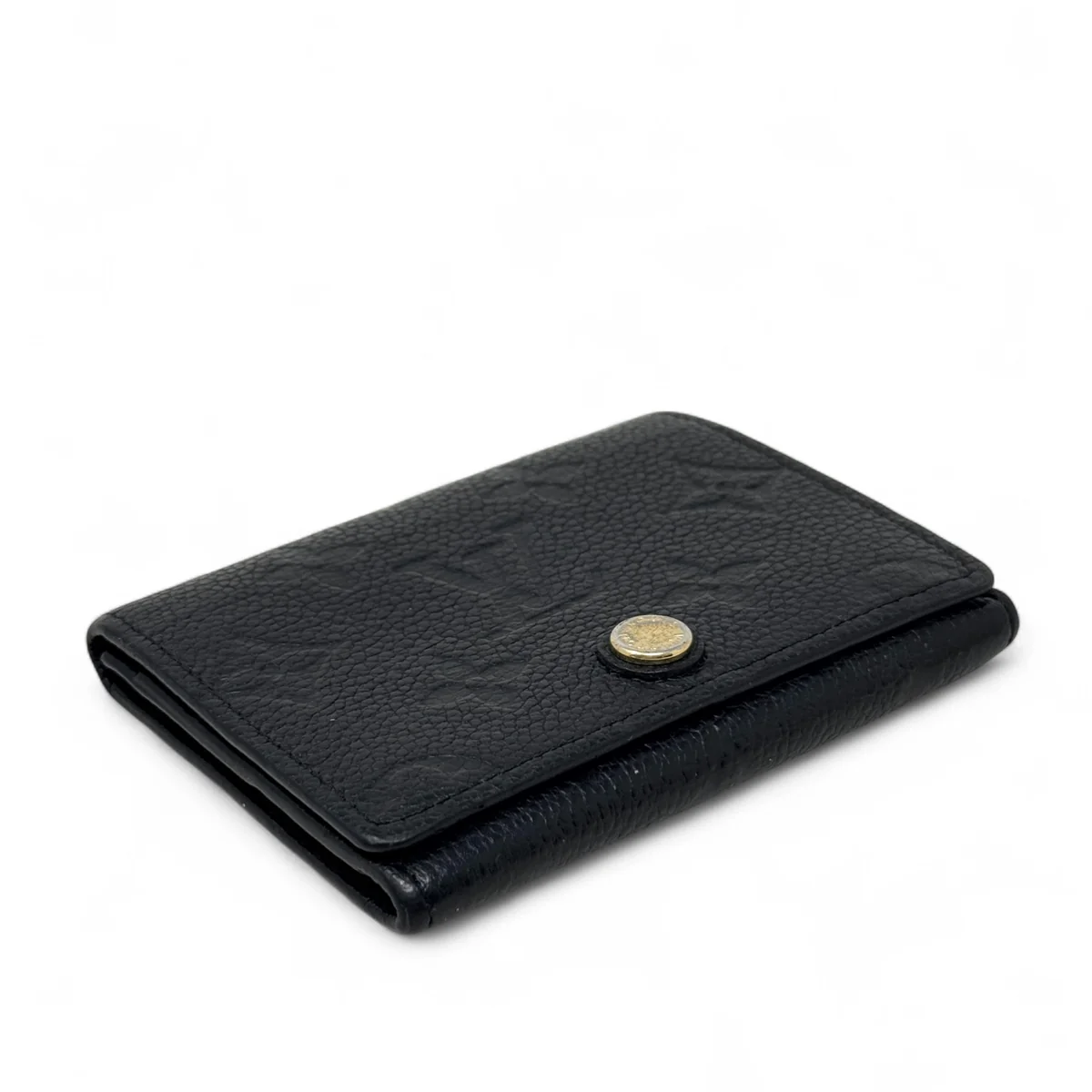 This Louis Vuitton Business Card Holder is crafted from supple Monogram Empreinte leather in black, accented with gold-tone hardware. The envelope-style flap opens with a snap closure to a compact leather-lined interior featuring one main compartment and an additional card slot, perfect for organizing business cards, IDs, or folded bills. Elegant and practical, it easily fits into any pocket or bag.