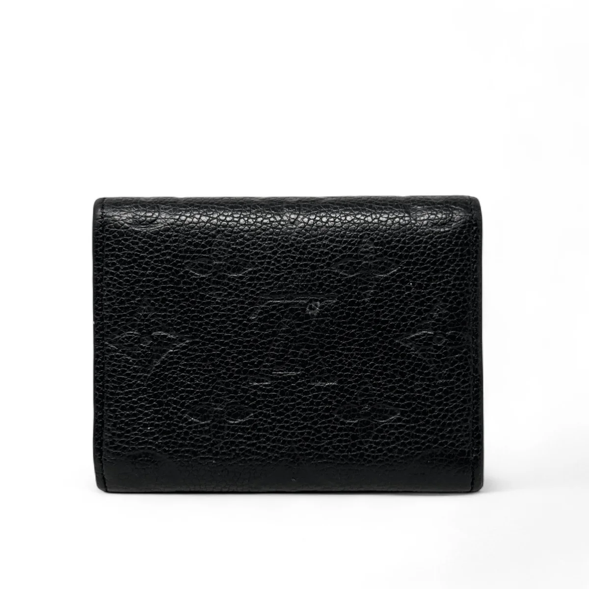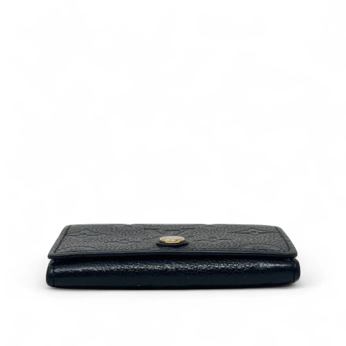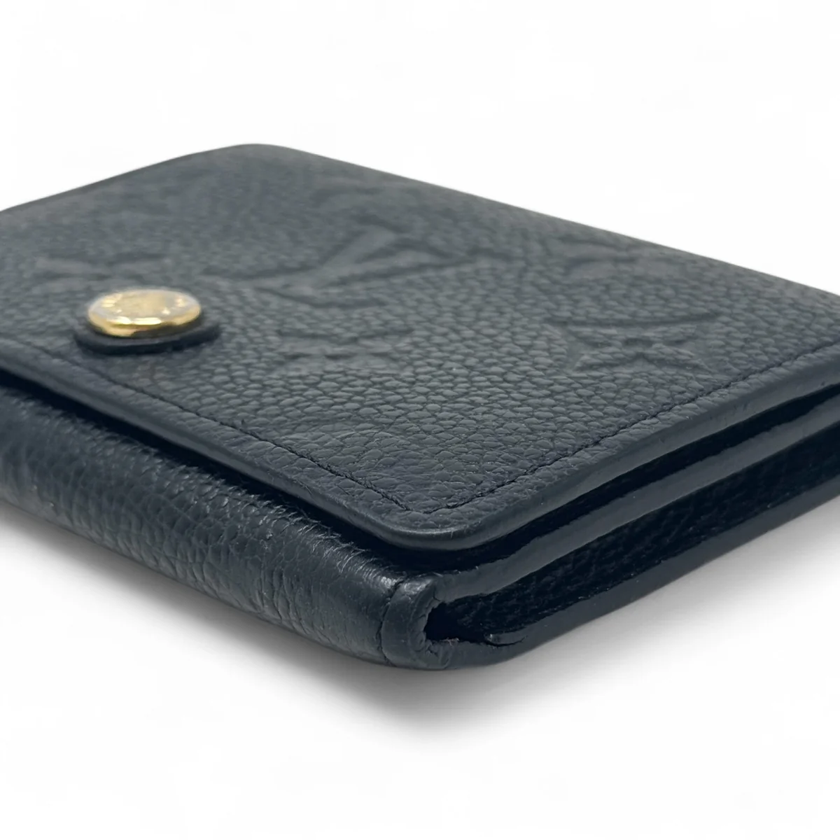 This Louis Vuitton Business Card Holder is crafted from supple Monogram Empreinte leather in black, accented with gold-tone hardware. The envelope-style flap opens with a snap closure to a compact leather-lined interior featuring one main compartment and an additional card slot, perfect for organizing business cards, IDs, or folded bills. Elegant and practical, it easily fits into any pocket or bag.