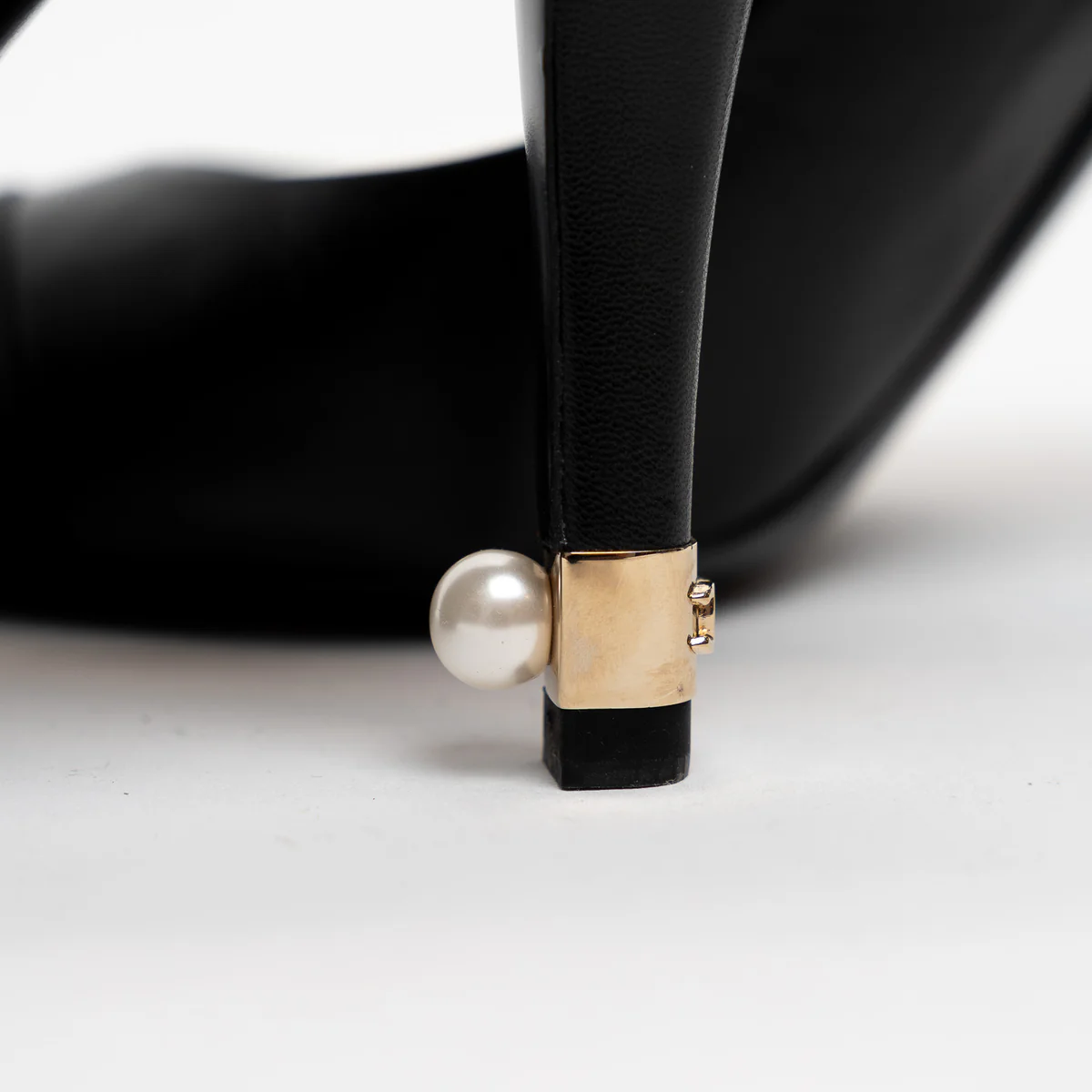 - Details: Ankle strap, Leather insole, Pointed toe, Gold tone heel tip with faux pearl and interlocking logo