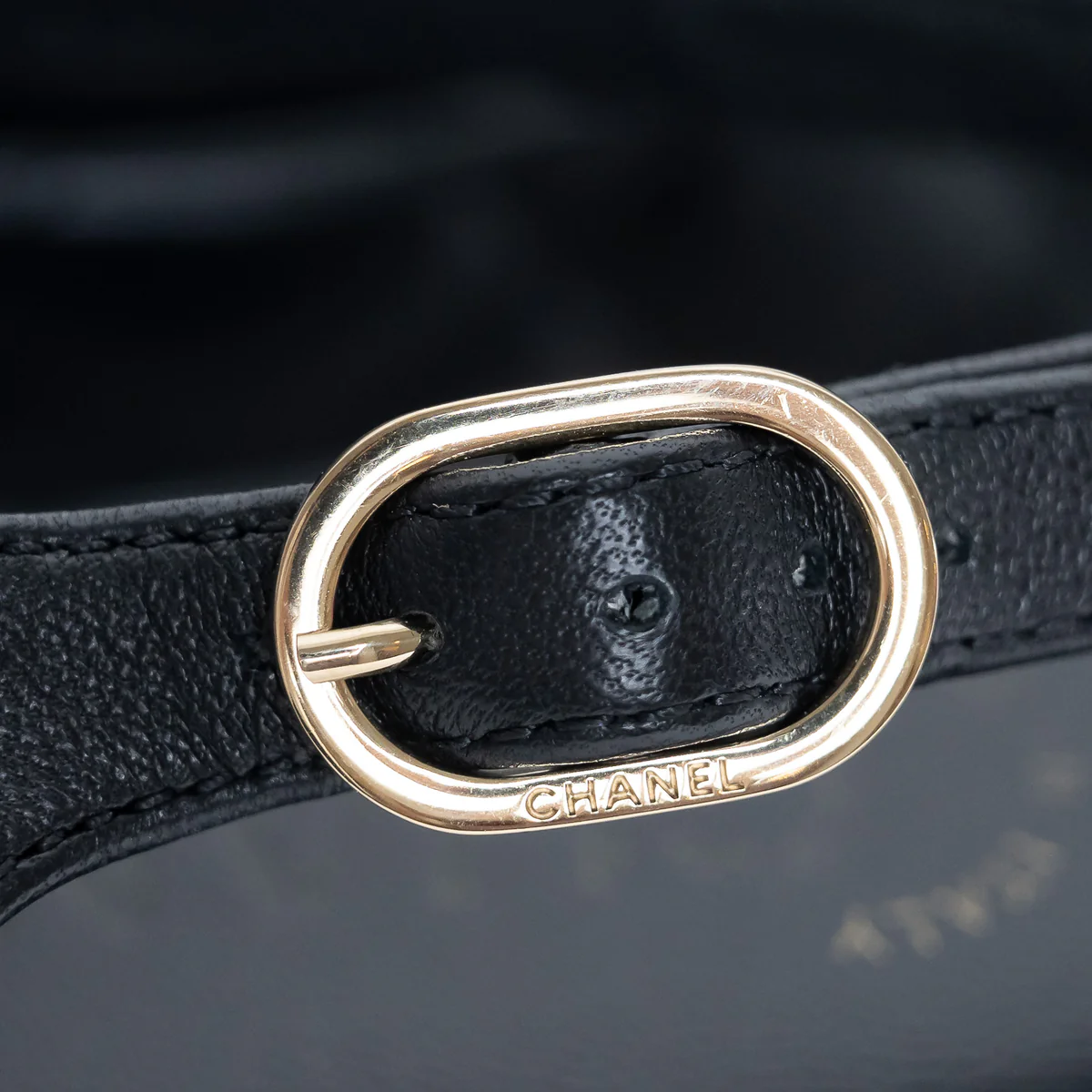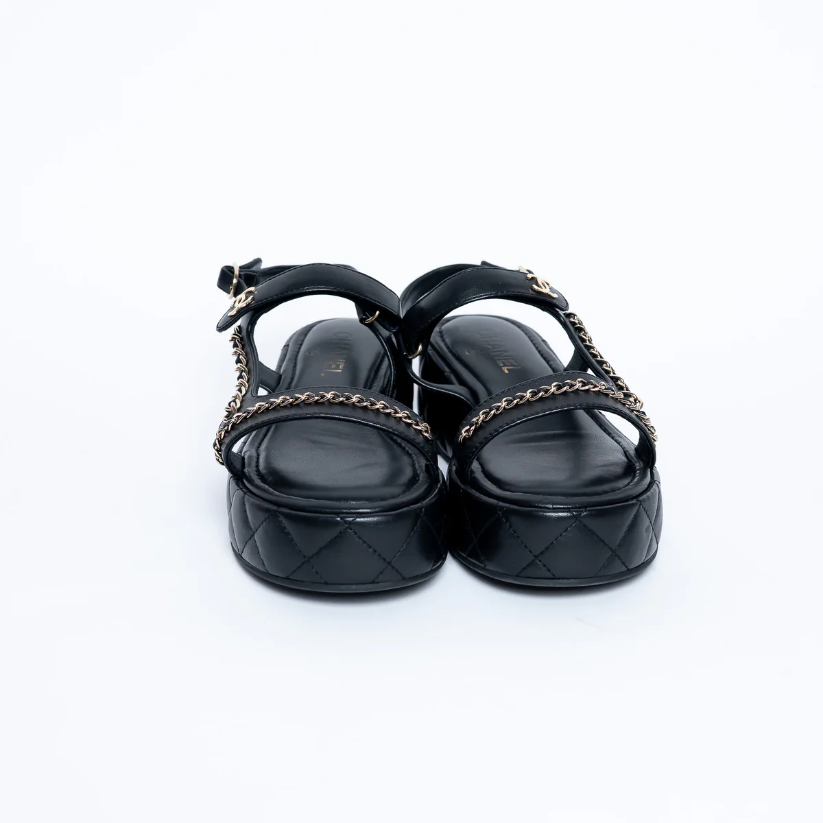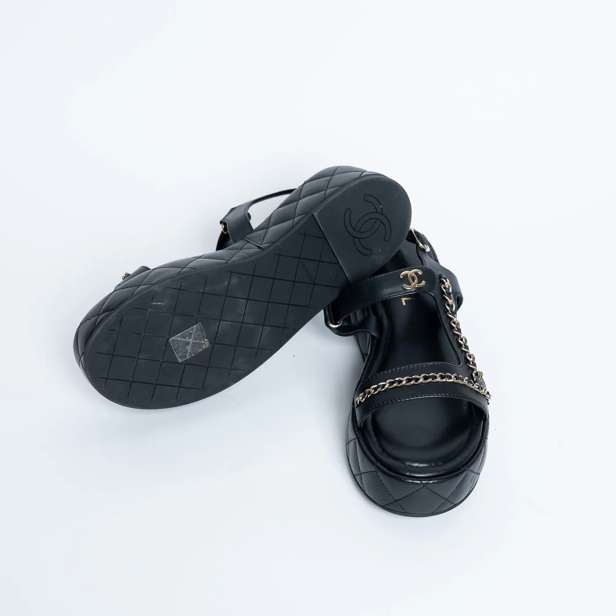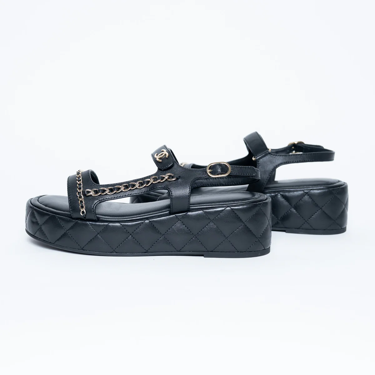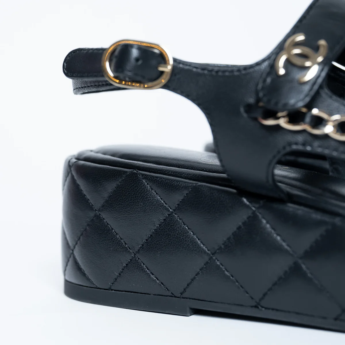 - Features: Classic diamond quilting on platform, adjustable ankle strap with buckle and velcro, woven chain details, interlocking CC logo on strap