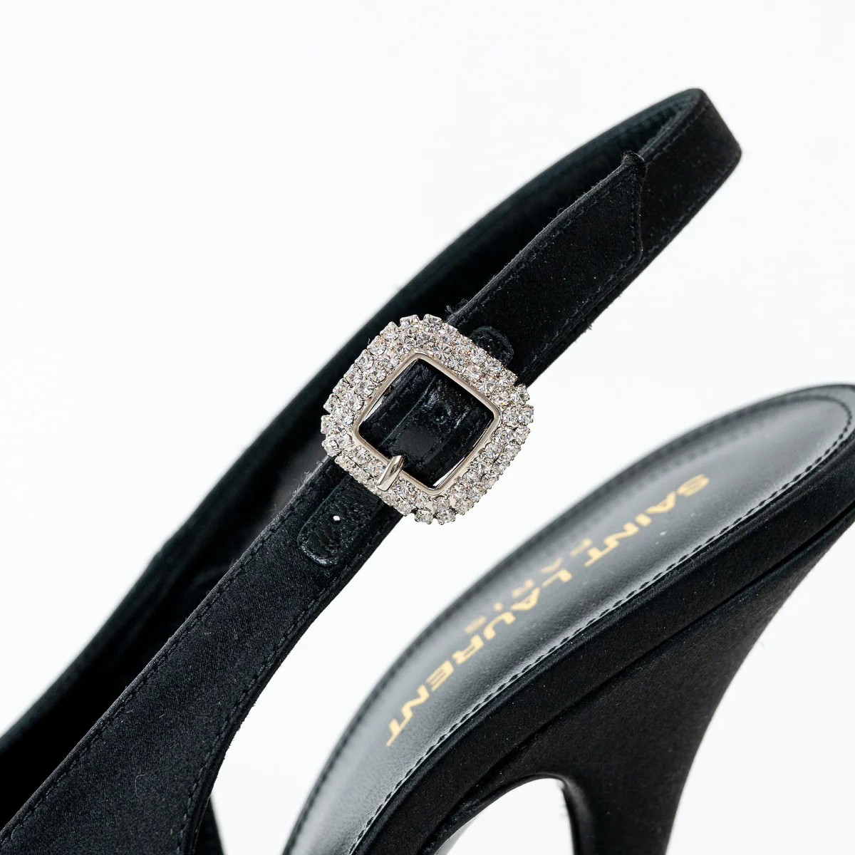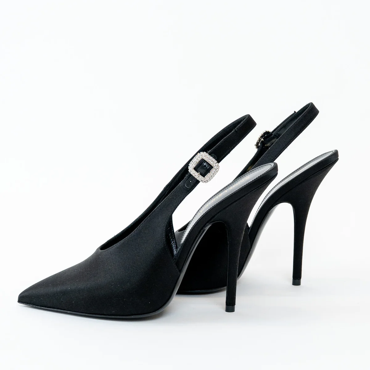 - Details: Crystal embellished buckle, Pointed toe, Satin stiletto heel, Leather sole, Leather insole