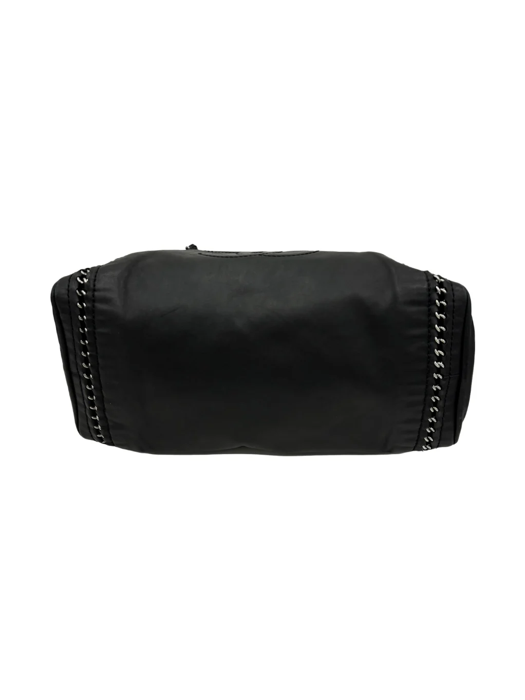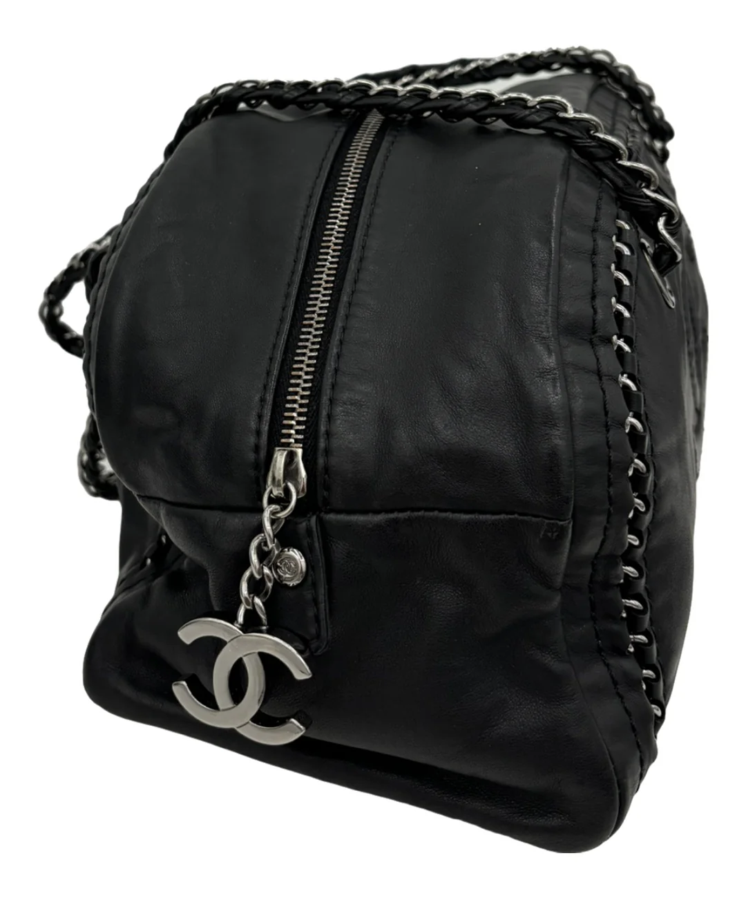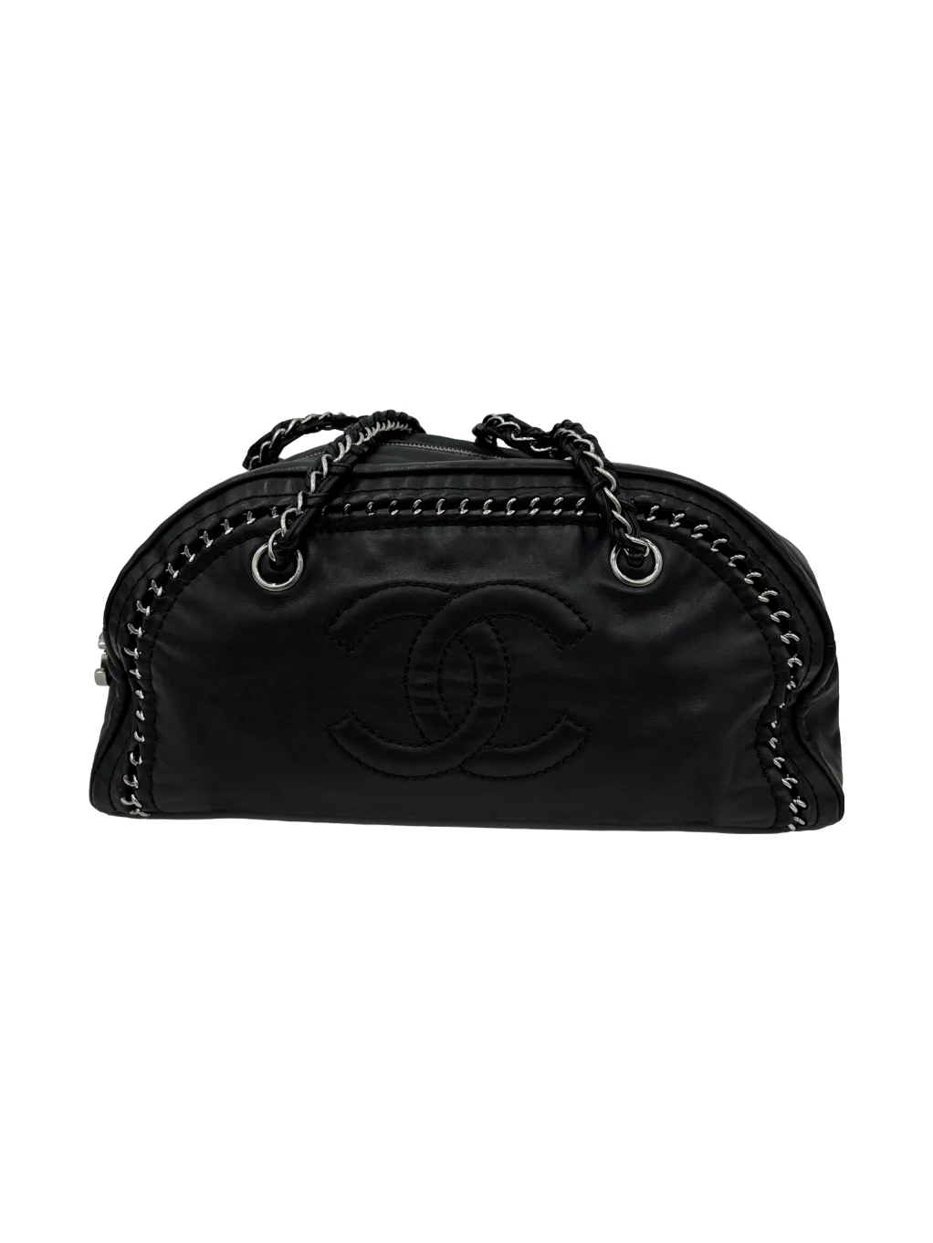 Leather shoulder bag by Chanel with a top zipper close, chain detail on the body and strap. The zipper is adorned with a logo, metal, zipper pull. Dust bag is included.