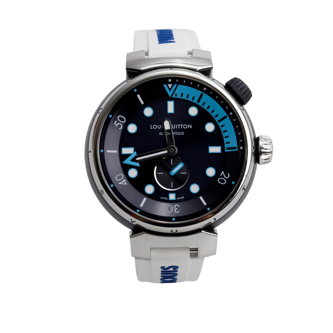 Stainless Steel & Blue PVD Tambour Street Diver 44 MM Automatic Watch QA121 w/ Box & Papers