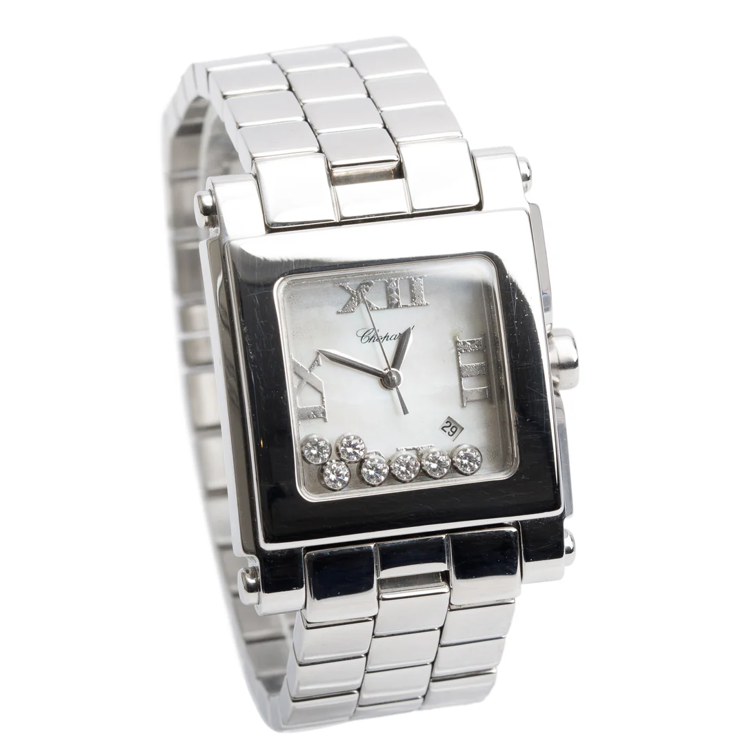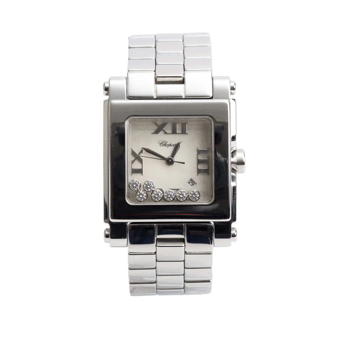 Stainless Steel Diamond Mother of Pearl Dial Happy Sport Square Quartz Watch 8495