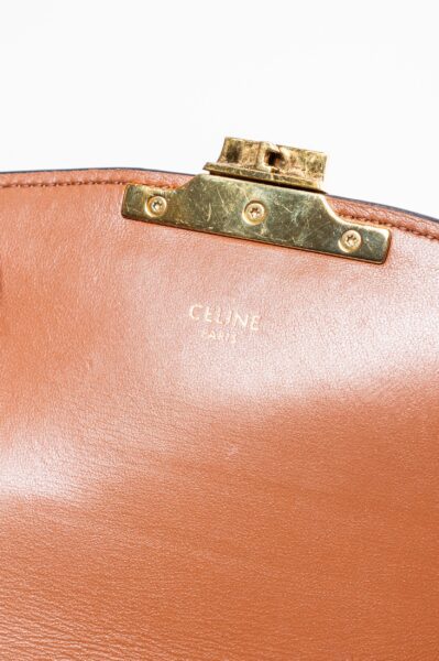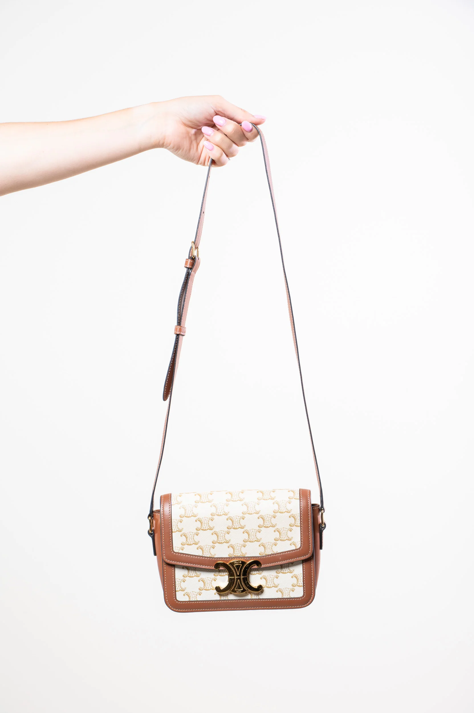 This pre-owned Celine Teen Triomphe Canvas Leather Crossbody Bag is a standout blend of classic craftsmanship and understated luxury. Crafted from durable camel and white coated canvas with smooth leather accents, it features a structured silhouette and a sleek flap front. The design is finished with gold-tone hardware and an adjustable leather strap for versatile wear. In excellent condition, this piece offers a refined look with lasting appeal—ideal for daily wear or dressing up minimal ensembles.