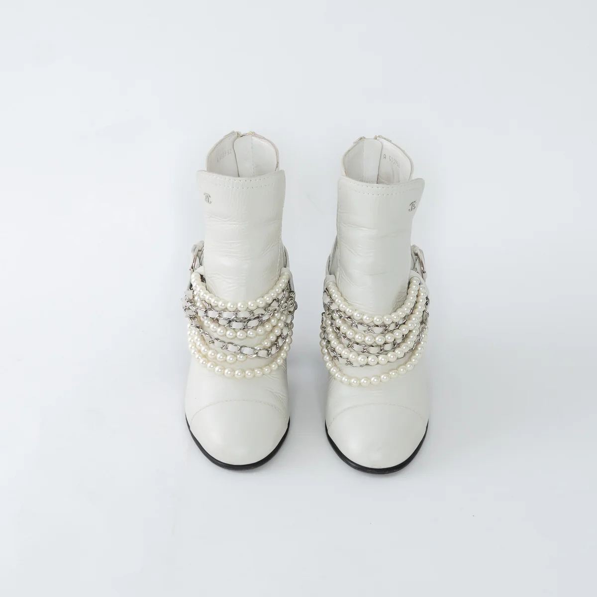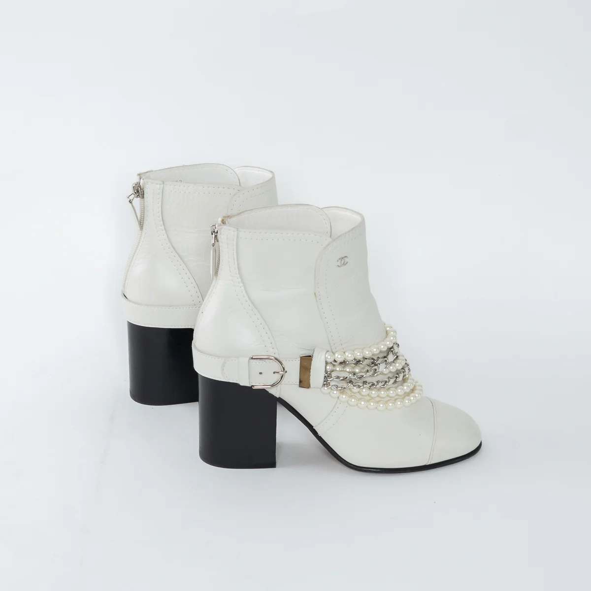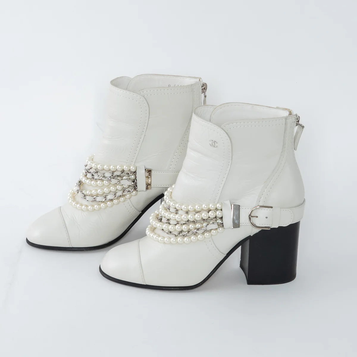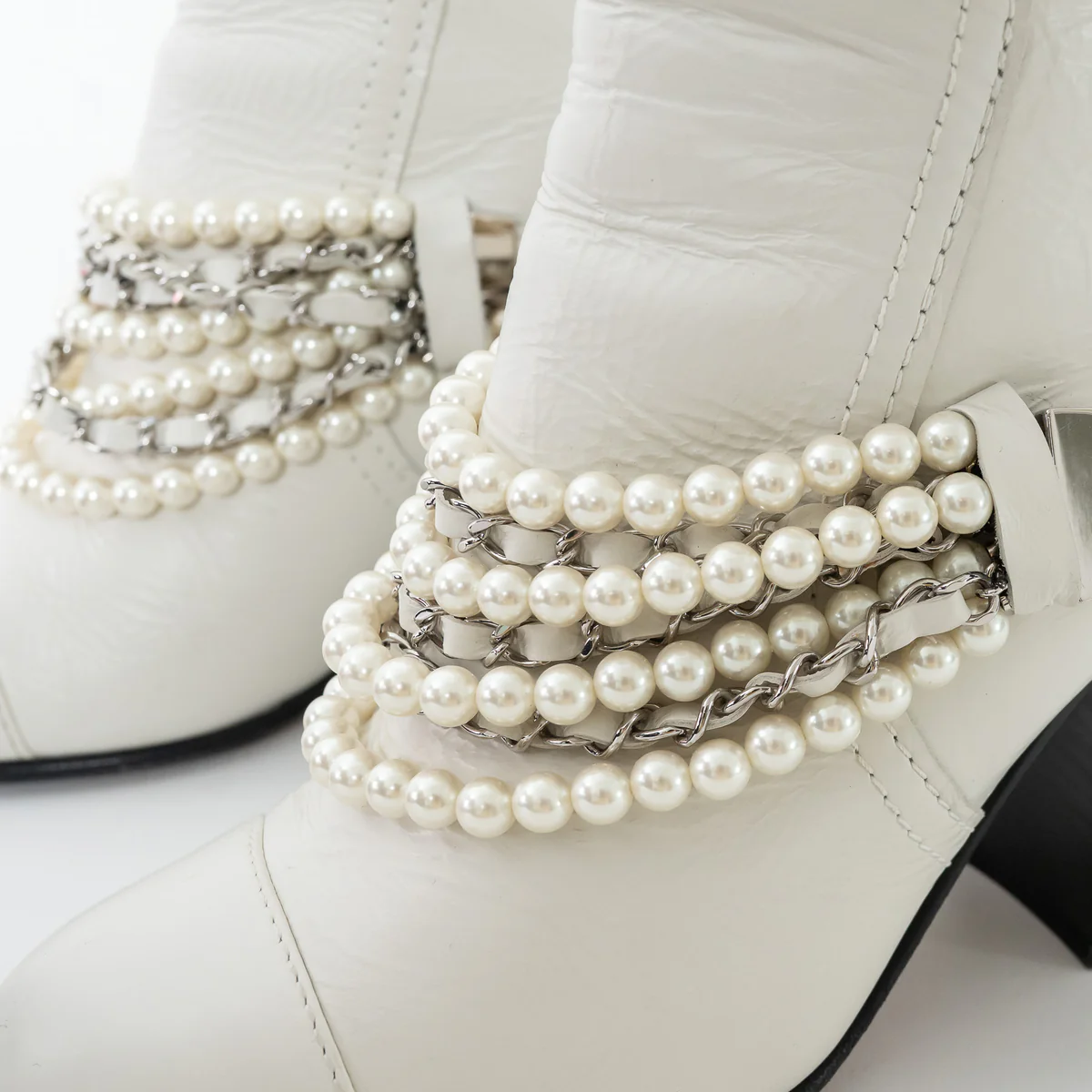 - Details: Crackled calfskin outer with black block heel, multi-strand faux pearl strap, back zipper, silver CC logo